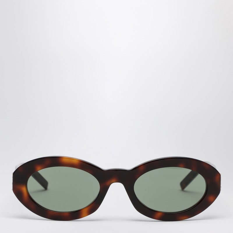 Saint Laurent sunglasses characterized by an oval frame in Havana tortoiseshell acetate, gold metal Cassandre detail on the temples, and black lenses with 100% UVA/UVB protection.