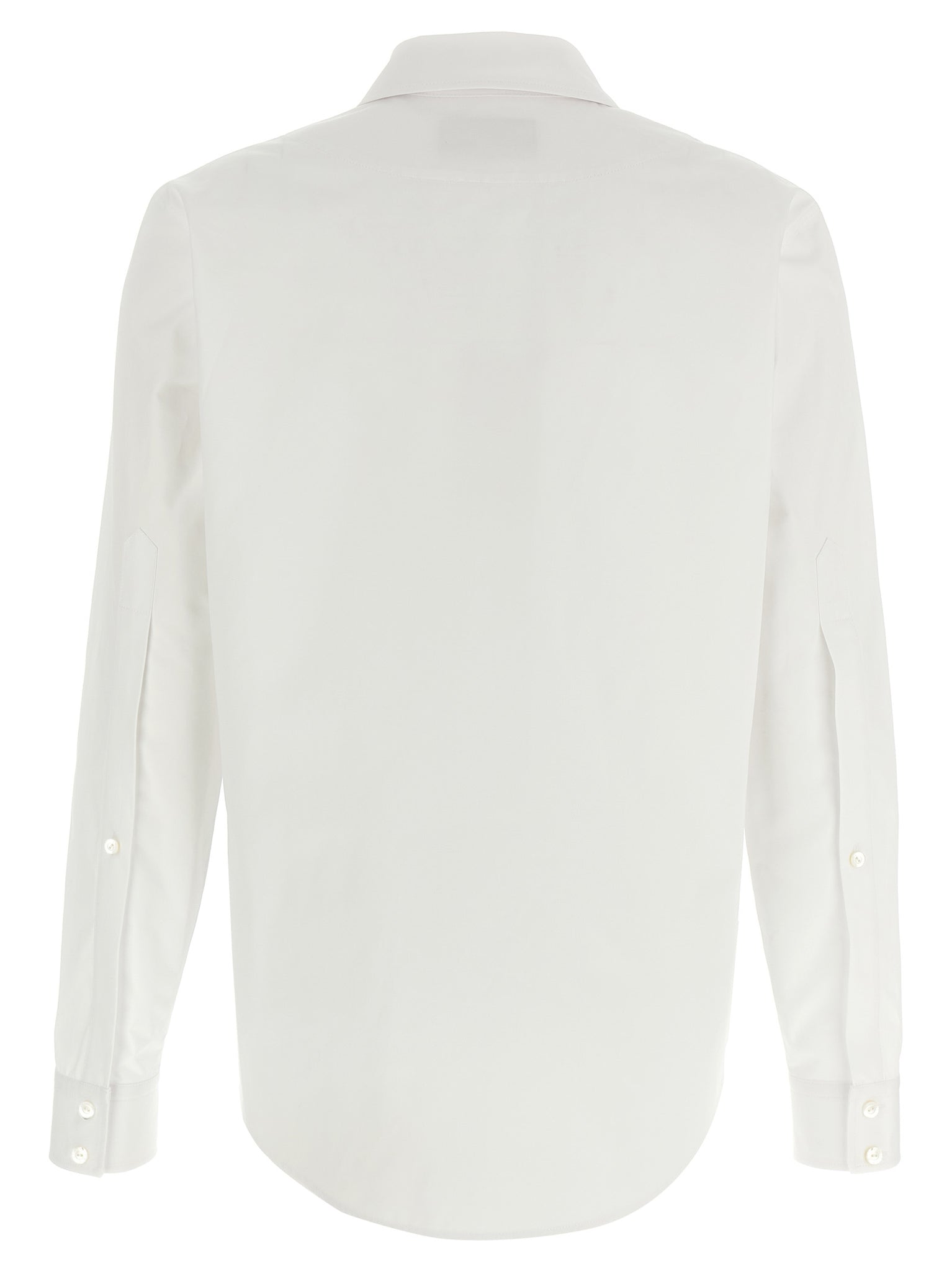 Cotton poplin shirt, Pointed collar with knotted webbing, Front concealed button closure with final metal clamp detail, Long cuffed sleeves. Size and Fit - true to size fitMade in: Italy