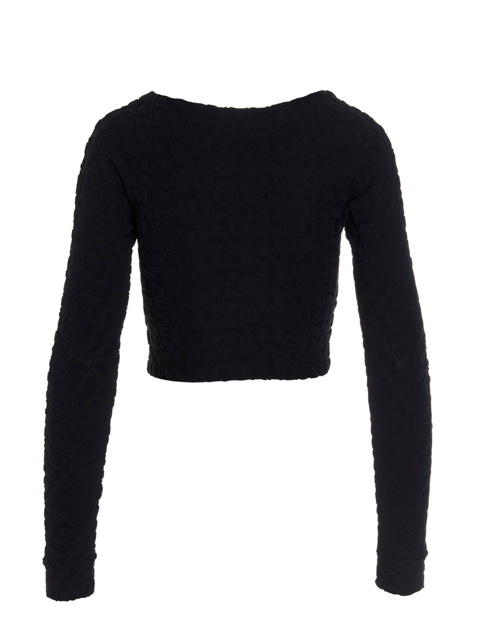 Mkodello cropped crewneck top with all-over embossed logo. Size and Fit - cropped fit.