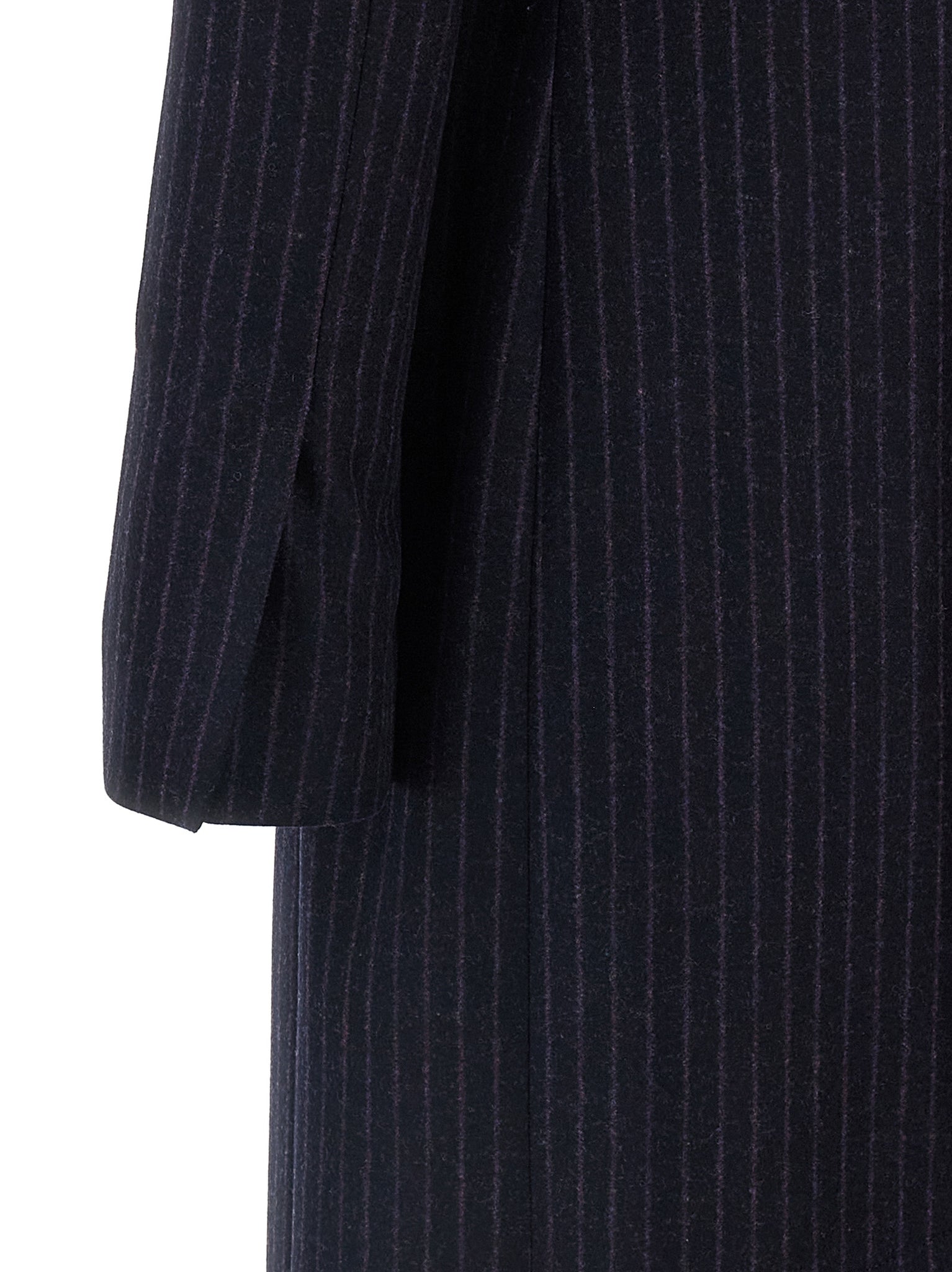 Double-breasted long coat in cool pinstriped wool with front button closure, peak lapels, flap pockets, structured shoulder strap, long flared sleeves with split on the cuffs, back vent, lining. Size and Fit - true to size fit