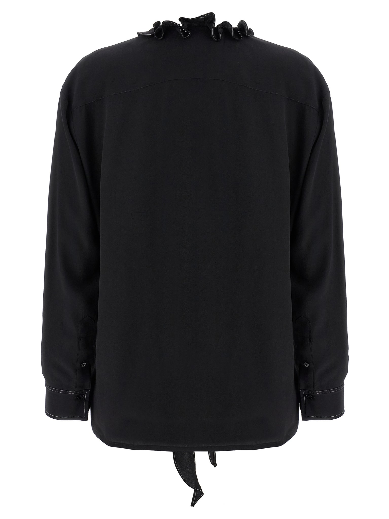 'Ruffle' tactile silk blouse, lavallière collar with ruffles and ruffles, contrast stitching, front button closure, long cuffed sleeves. Size and Fit - true to size fit - UK sizing