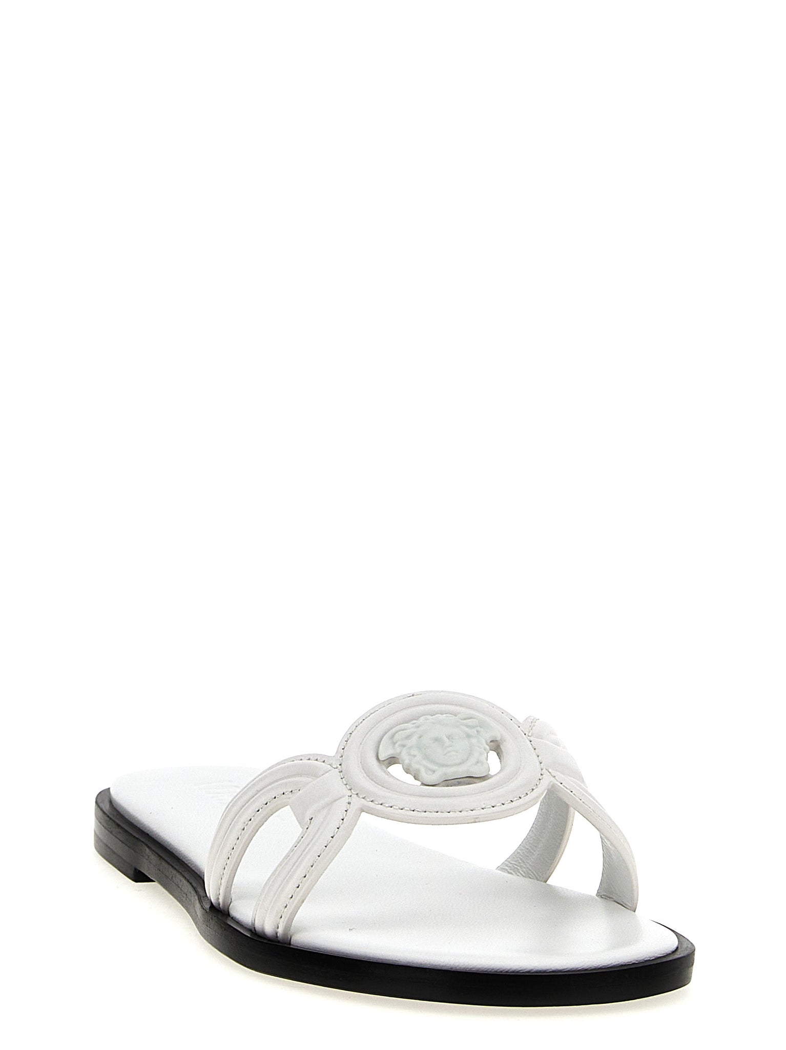 Discover the Versace Medusa 95 Sandals in white, crafted from leather with a leather sole and distinctive 'medusa '95' logo and cut-out details that elevate seasonal outfits. These adult women's sandals offer structured support and a refined aesthetic suited to tailored summer looks. Refer to EU WOMEN sizing for fit guidance. LDin,