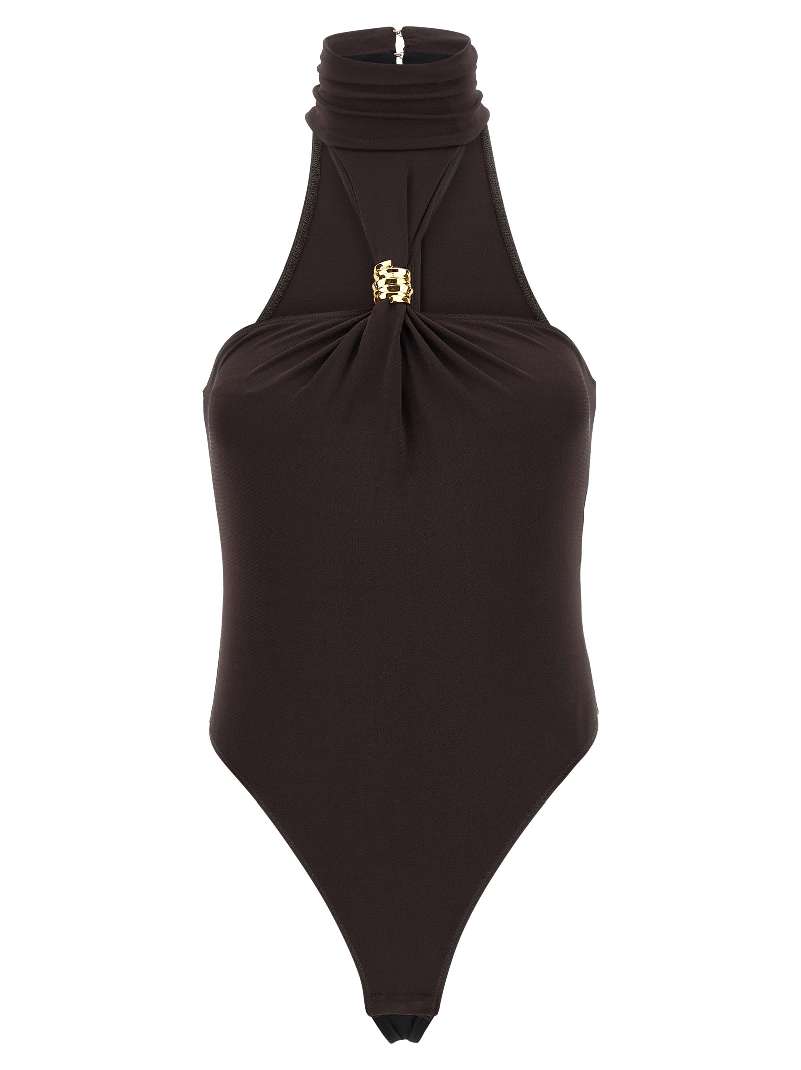 This slim-fit Jersey crêpe bodysuit from Elisabetta Franchi features a high neck and a metal jewel detail at the front that elevates evening or smart-casual looks. It fastens with a back zip and snap buttons at the hem, offers a high leg cut, and includes a knit lining for comfort. Designed for adult women in a brown shade, the piece balances polished style with secure, body-conscious shaping.