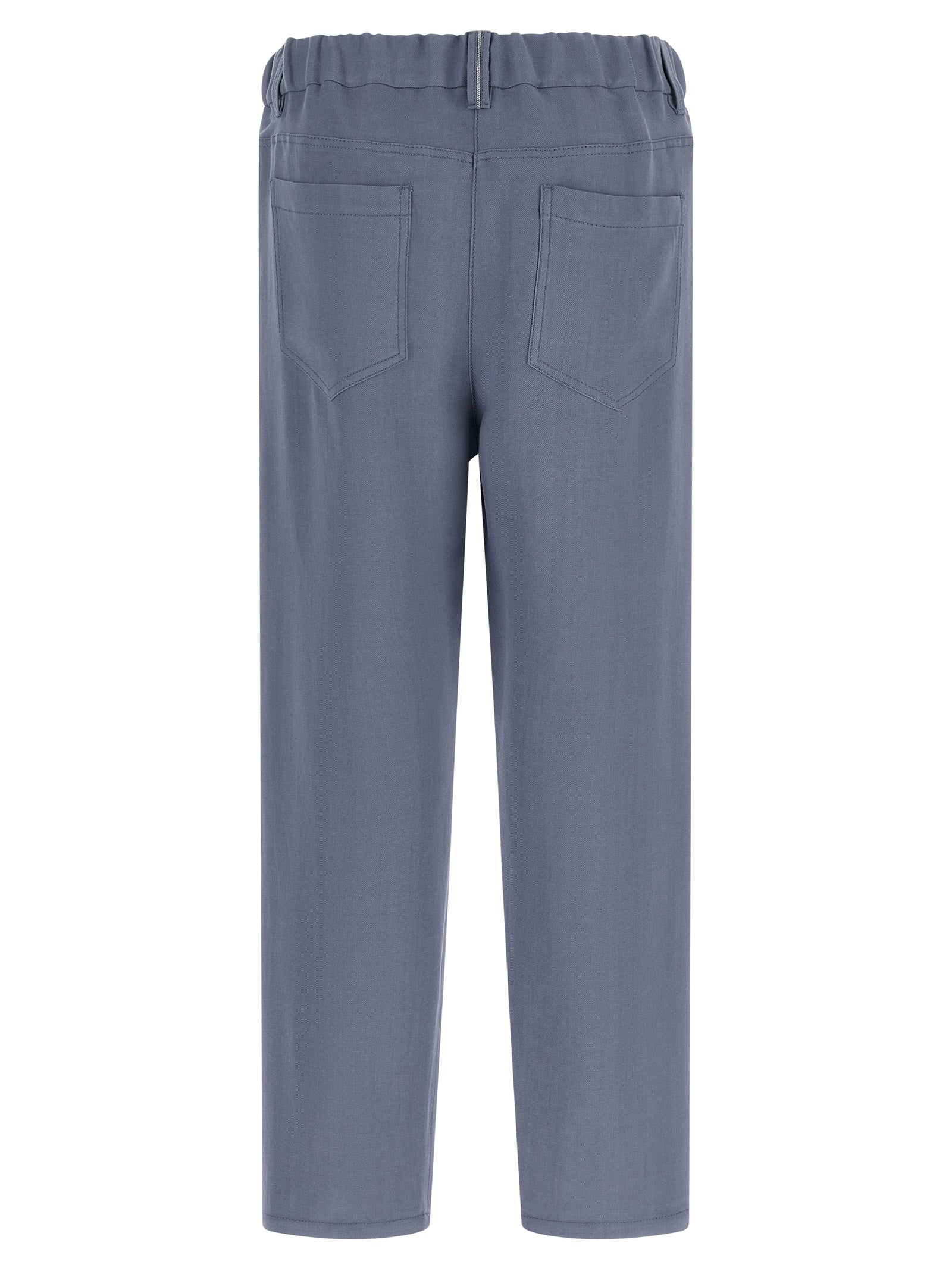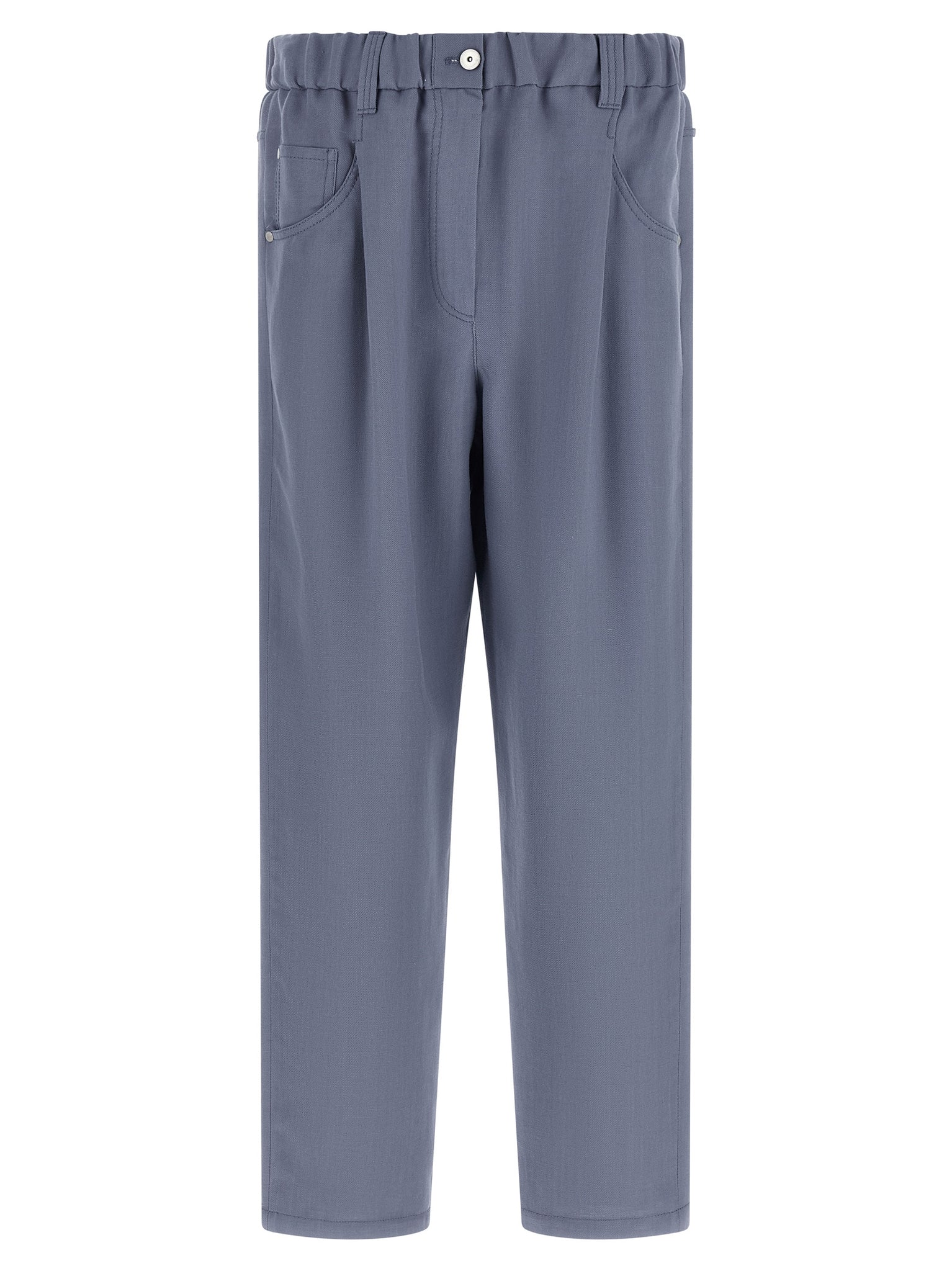 These Brunello Cucinelli Baggy Pants are crafted from a viscose and linen fluid twill with a crunchy, lightweight hand that drapes in relaxed volumes through the pelvis and leg. The silhouette features pinces, an elastic waistband with zip and front button closure, five pockets and a signature monile detail at the back for subtle refinement. Designed for an adult female, the trousers come in blue and fit true to size, balancing comfort with a tailored aesthetic.