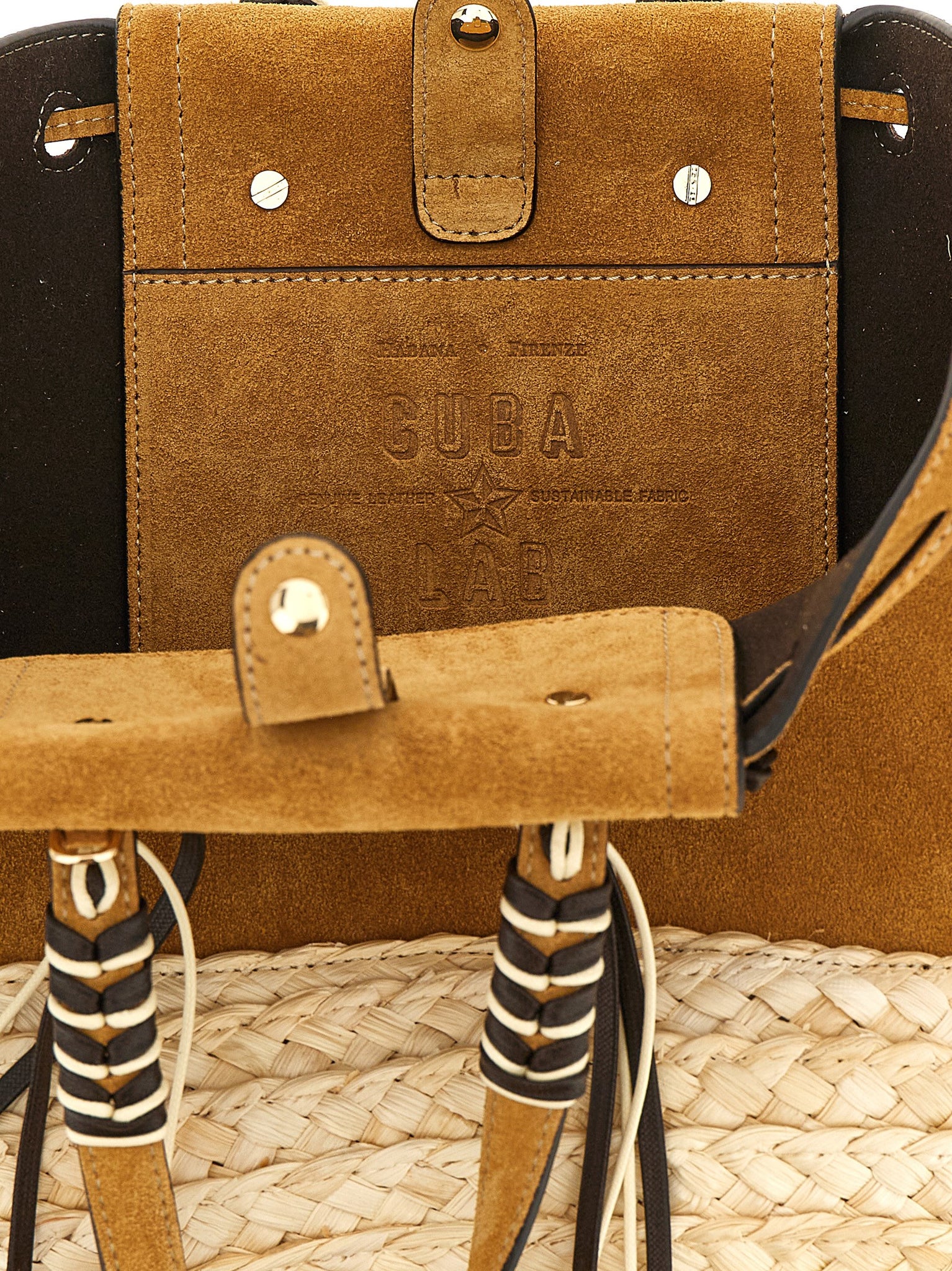 Cuba lab x san pa 'bolero' shopping bag in woven raffia and suede, Unlined, Flaps and double fixed handle decorated with woven waxed cords, Drawstring, Internal snap button closure, Adjustable and removable shoulder strap. Produced in italy by sanpatrignano, With love. Handcrafted product, Any imperfections are to be considered characteristics of uniqueness. Sustainable: product made with recycled materials. Size and Fit - W 42 x h 28 x d 13 cm
