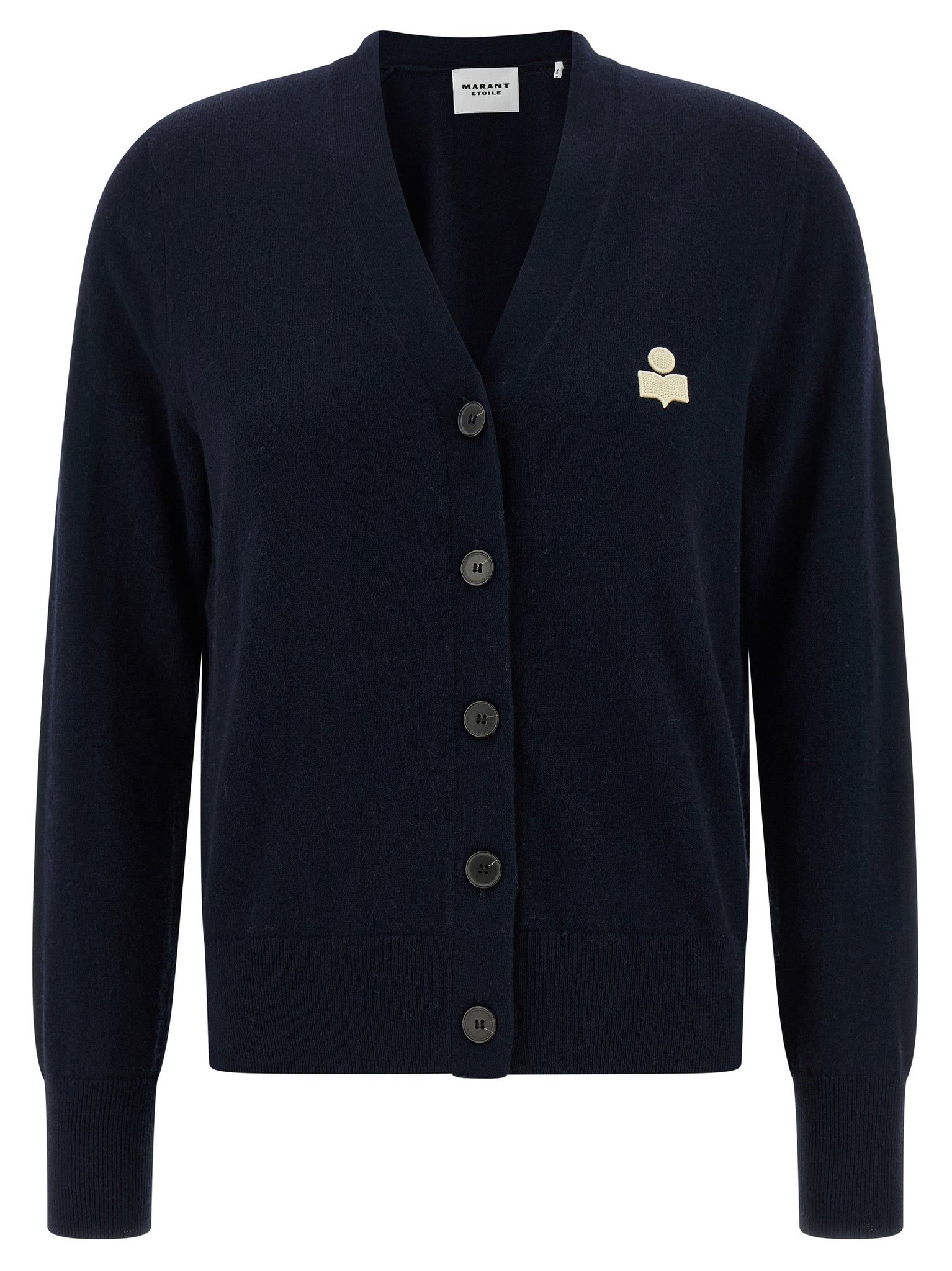 'karina' mélange cotton and wool blend cardigan, Contrast logo embroidery and front horn button closure, V-neck, Long cuffed sleeves, And band on the hem. Size and Fit - true to size fit - FRENCH size