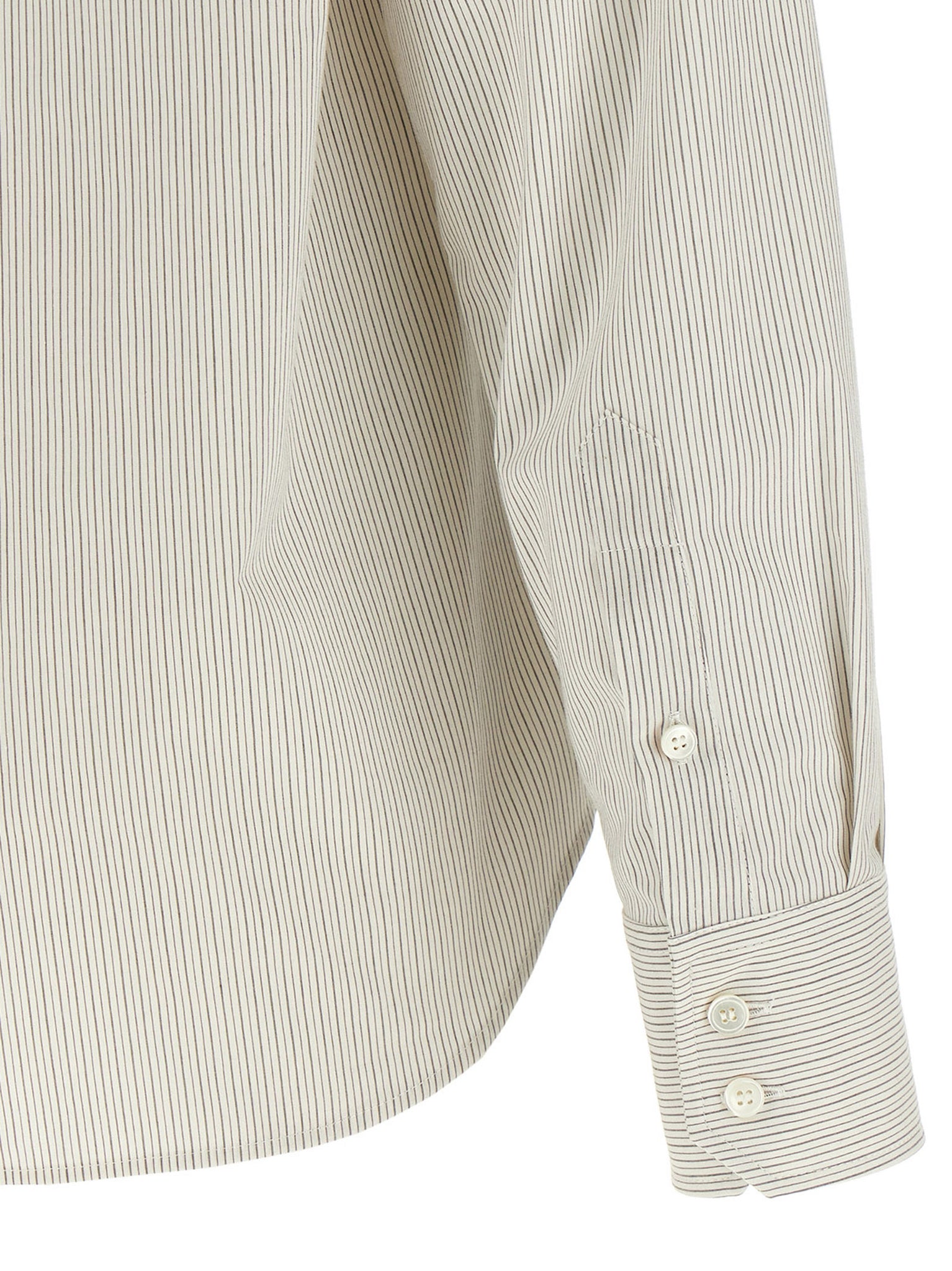 Striped cotton poplin shirt, Trompe l'oeil collar with raw cut hem, Front mother-of-pearl button closure, Long cuffed sleeves, Rounded hem, 'white stitch line' at the back. Size and Fit - True to size fitMade in: Italy
