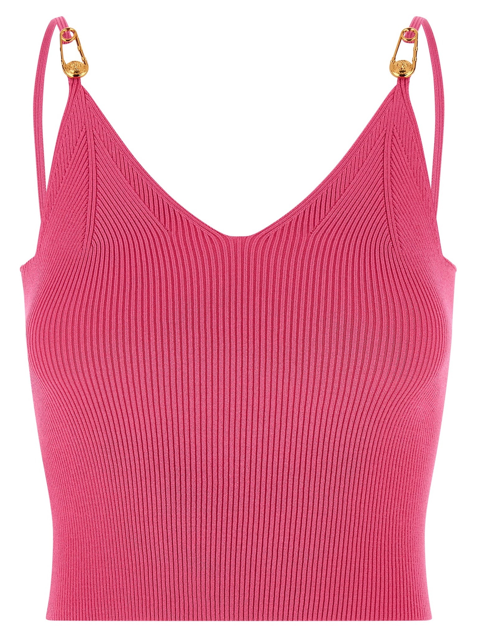 Stretch ribbed knit crop top with V-neck, thin straps with metal 'Safety Pin' detail. Size and Fit - Slim fit