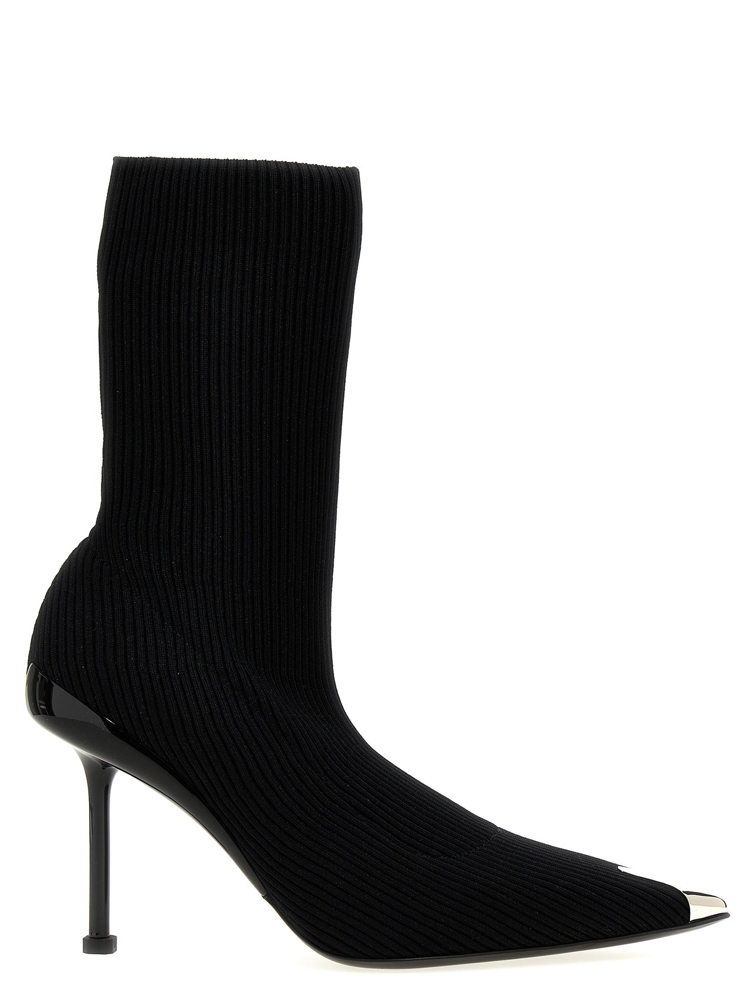 'Slash' ribbed knit ankle boots with silver metal punk-style toe, tone-on-tone lacquered heels with cut-out and a silver soul. Size and Fit - EU WOMEN Heels: 9 cm