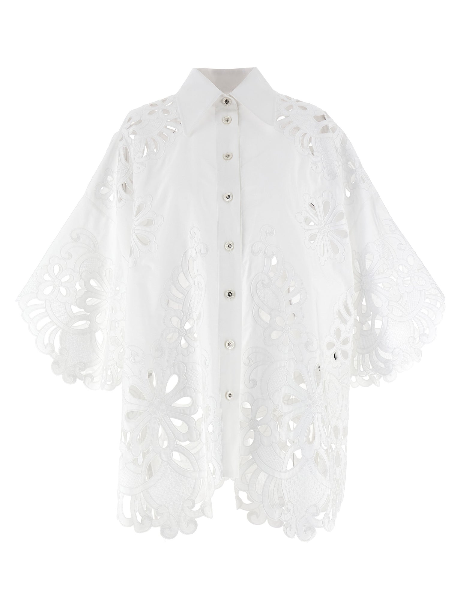 Cotton shirt with all-over cut-out embroidery, button closure, wide 3/4 sleeves. Size and Fit - oversized fit