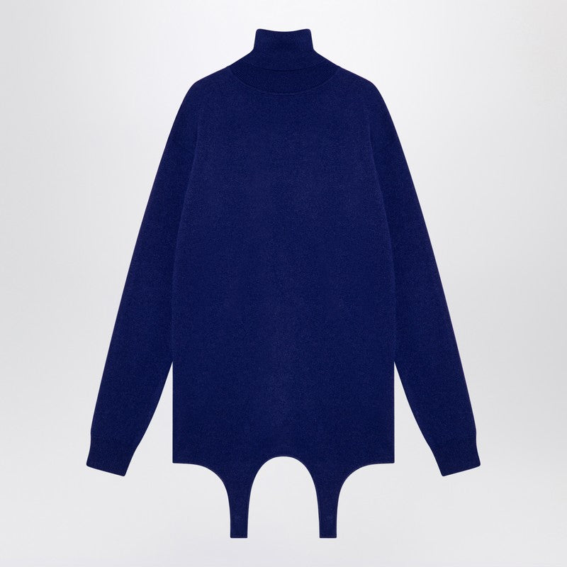 Discover a tailored cashmere pullover from Saint Laurent that pairs a high collar and long sleeves with a garter belt detail at the hem for a defining silhouette. The ribbed trims create structure while the electric blue hue brings a modern, disco‑inspired edge to evening and daytime wardrobes. Model wears size S; measurements: Height 179 cm, Chest 82 cm, Waist 65 cm, Hips 90 cm.