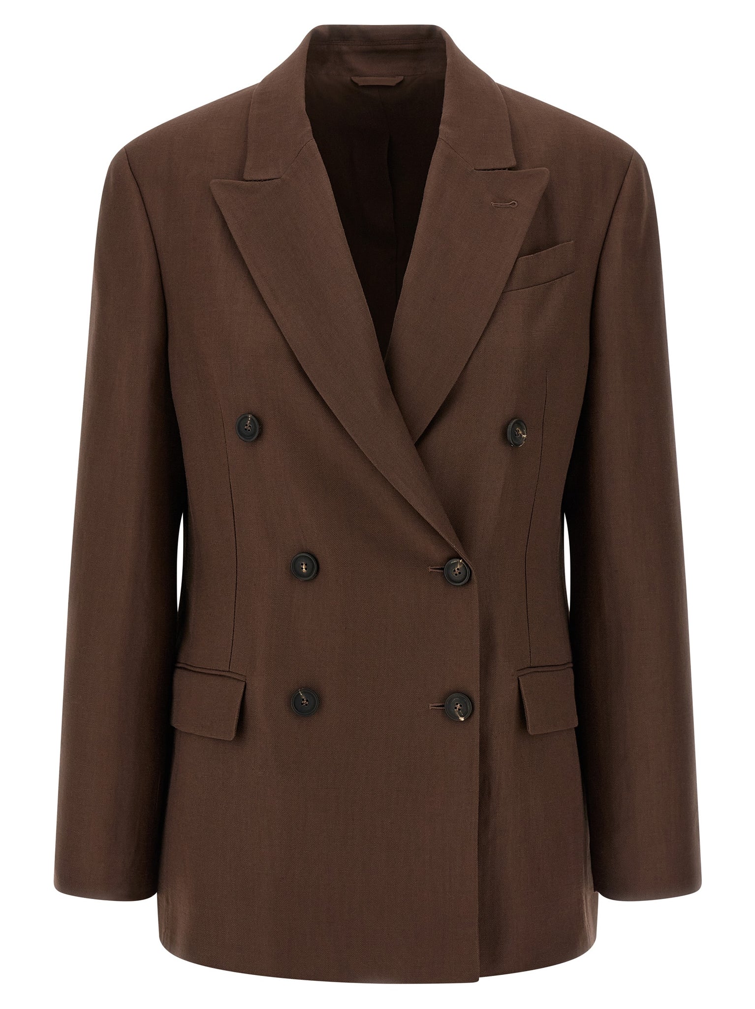 Blazer in linen blend, neckline with peak lapels, double-breasted style with buttons, slightly flared waist, pockets, back central split, long sleeves with buttons. Size and Fit - True to size fit