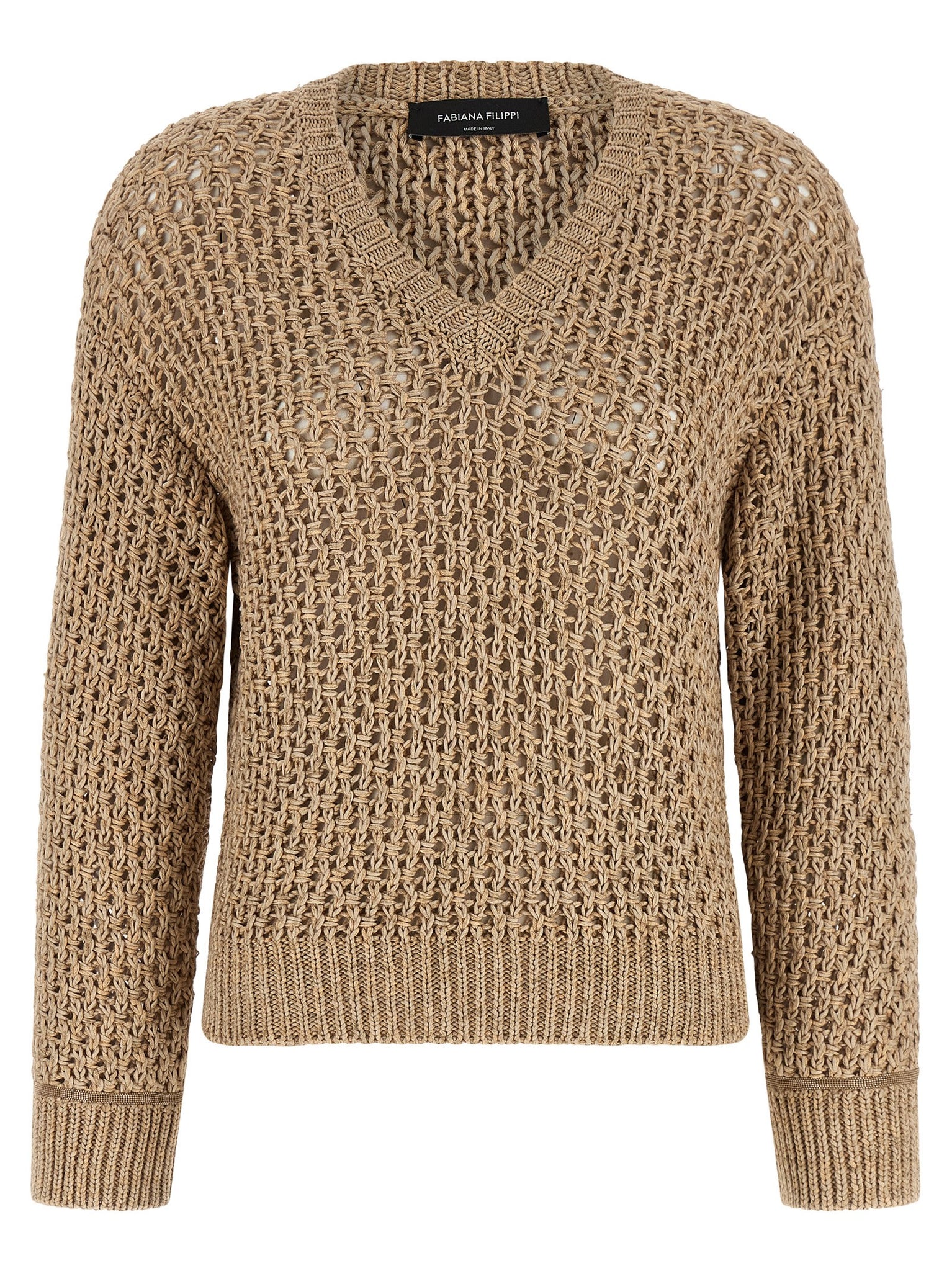 Discover a brown Fabiana Filippi Mouliné yarn sweater with a V-neck and long sleeves finished with cuffs and a dropped shoulder for relaxed wear. The bark stitch knit is blended with cotton tape and finished with a hem band that maintains shape and drape. This piece fits true to size and offers breathable structure from the mixed yarn construction. Ideal for layering, it balances textural interest with refined simplicity.