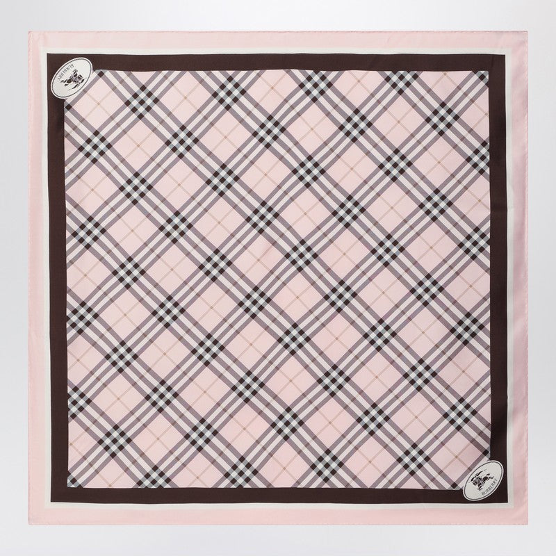 Burberry silk scarf in pink, characterized by Check pattern, logo lettering, and Equestrian Knight logo.