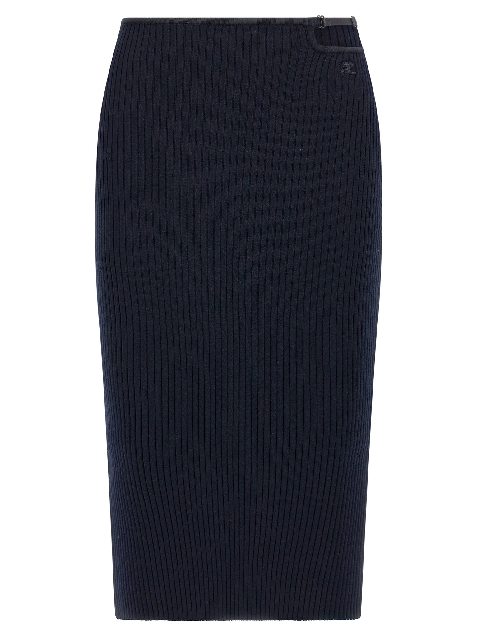 Discover a tailored midi skirt that balances structure and ease for everyday wear. The Courreges Loop Rib Knit Skirt features a cut-out at the waist with an adjustable strap and a tonal logo patch that keeps branding subtle. Its ribbed knit construction provides stretch and a flattering silhouette while remaining true to size. Pair it with tucked tops or layered knits to guide versatile wardrobe choices.