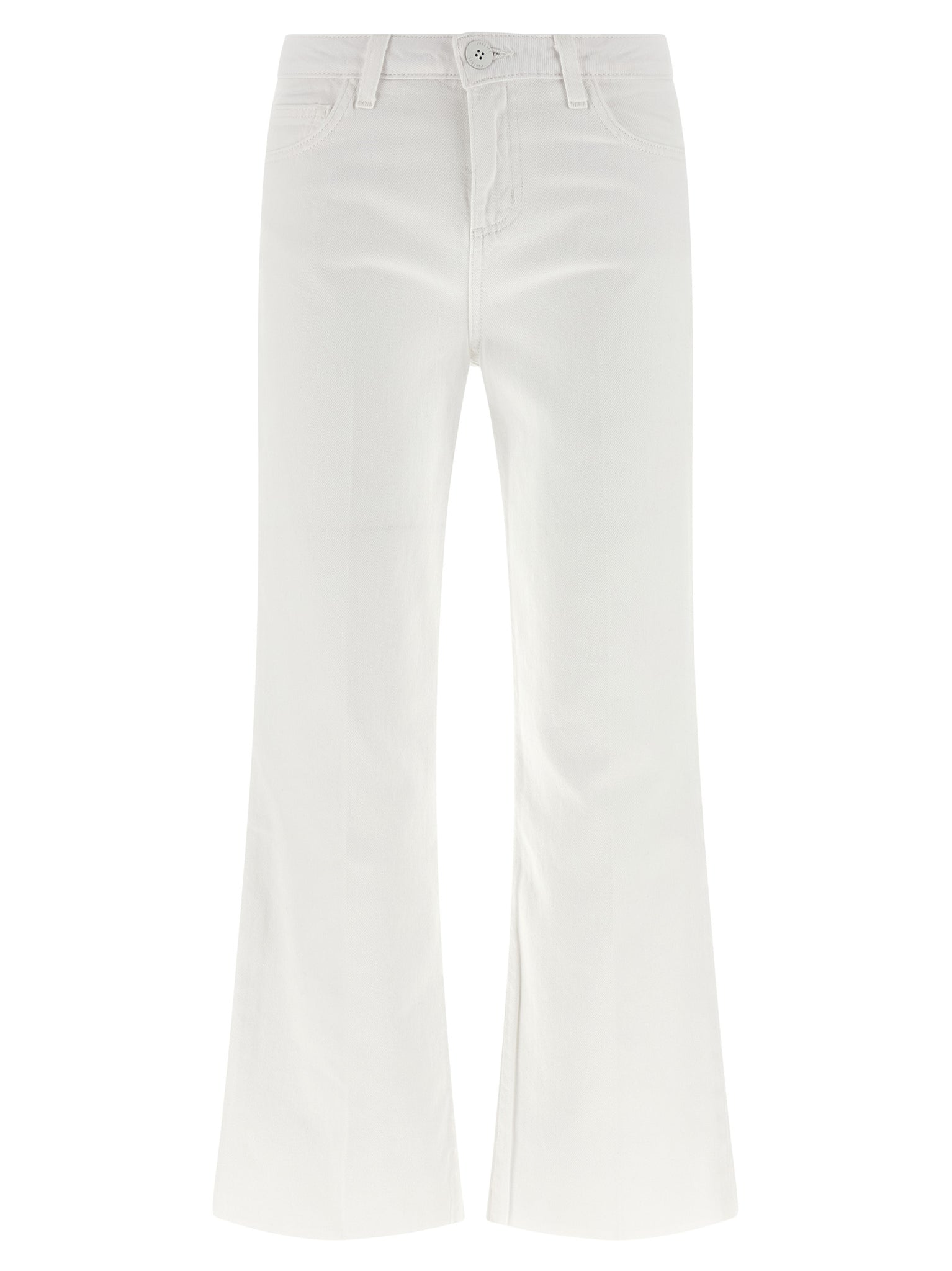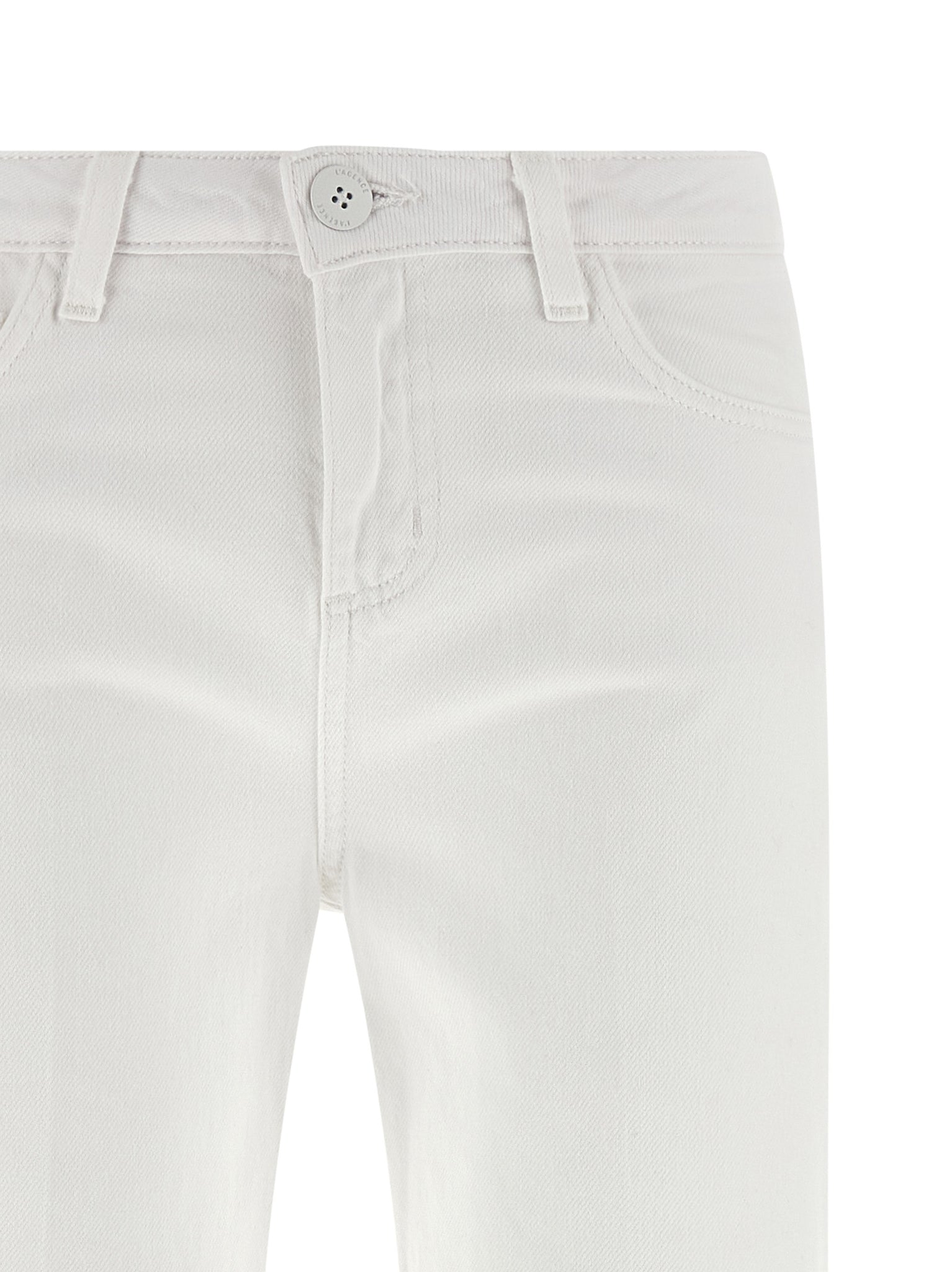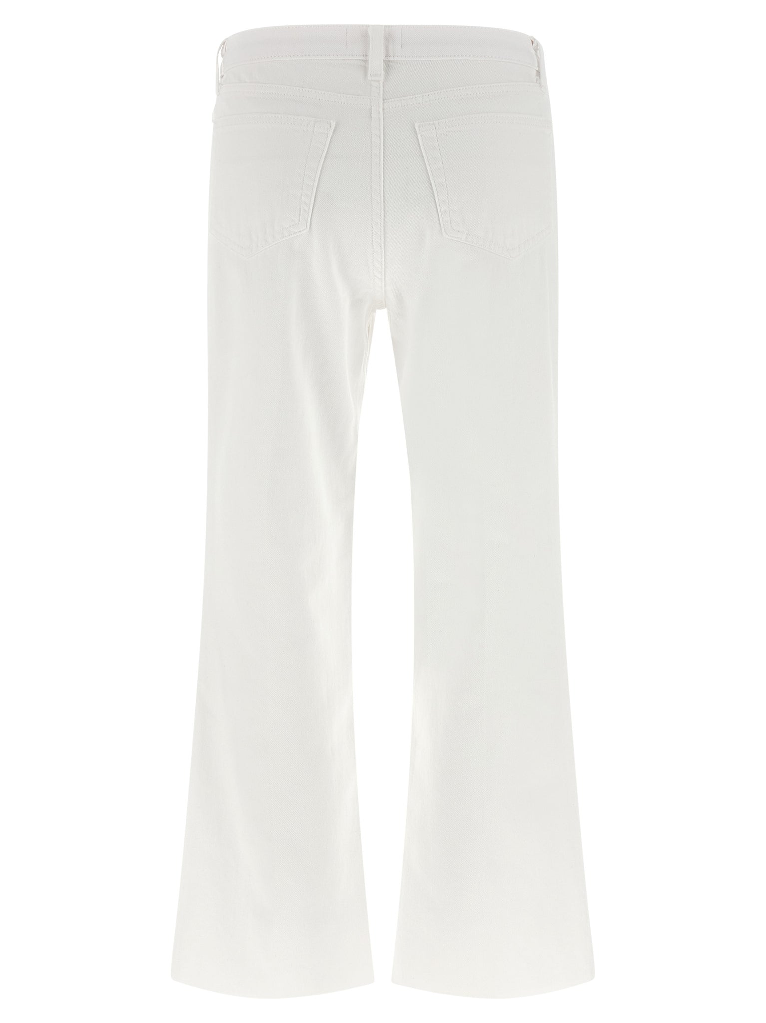 Discover the L'agence Wanda Jeans in white, a cropped cotton denim with a flared leg that balances modern style and everyday wearability. These low-waist jeans feature a zip and front button closure, five pockets, and a raw cut hem for an effortless edge. The fit runs true to size, offering comfortable shaping through the hips and a cropped silhouette that pairs well with flats or heels.