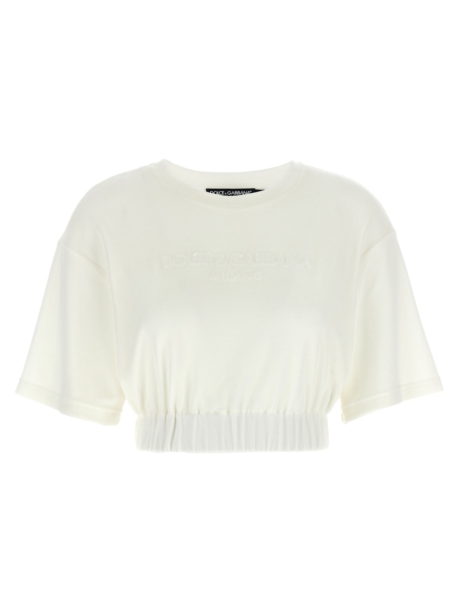 Cotton chenille top with embossed logo on the front, cropped model, crew neck, short sleeves, elastic hem. Size and Fit - true to size fit