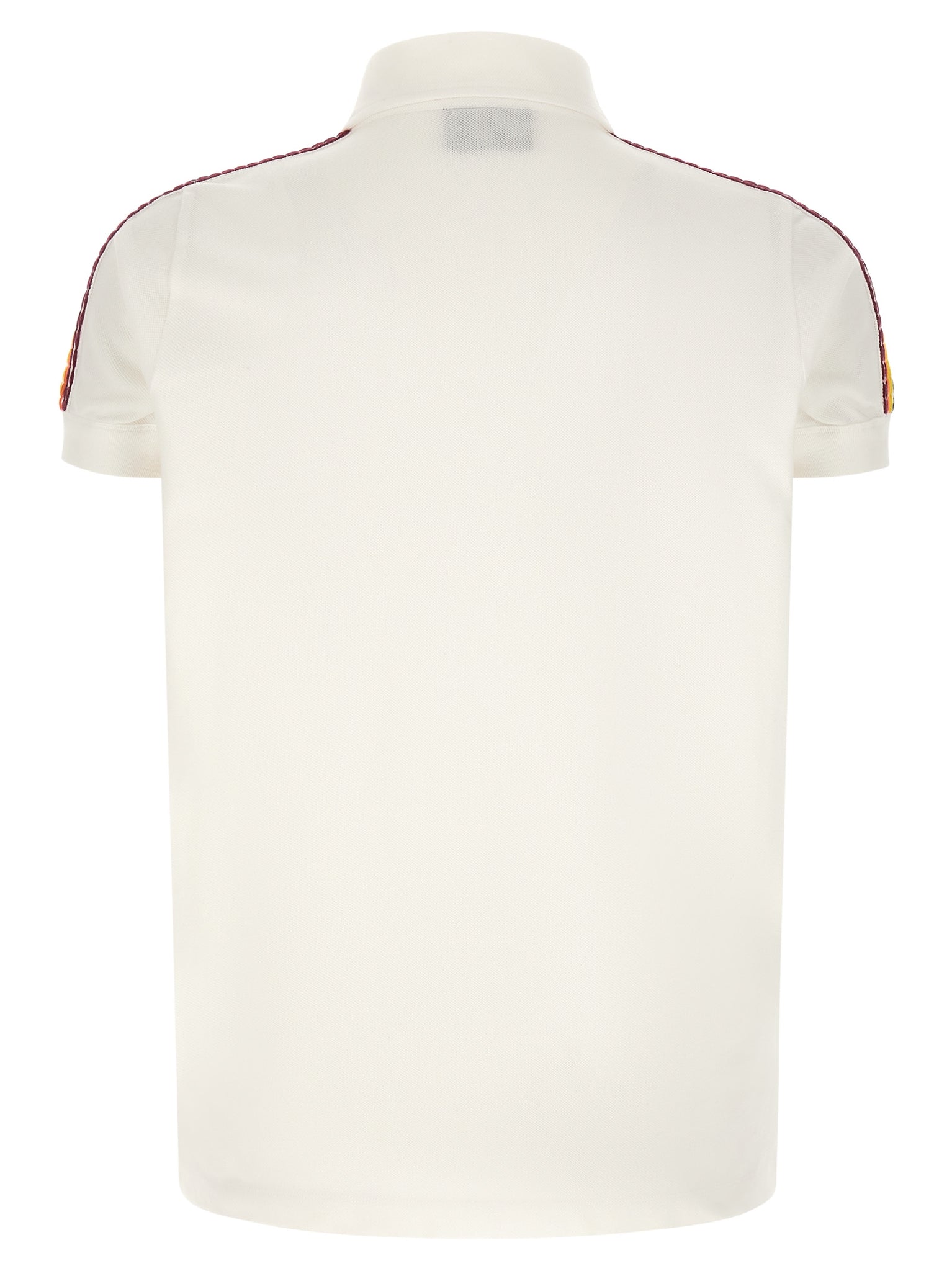 'be proud' cotton piqué polo shirt with multicolor yarns on the shoulders, Front logo embroidery, Collar and buttons, Short short sleeves with cuffs, Side slits, And asymmetrical hem. Size and Fit - Cool fit