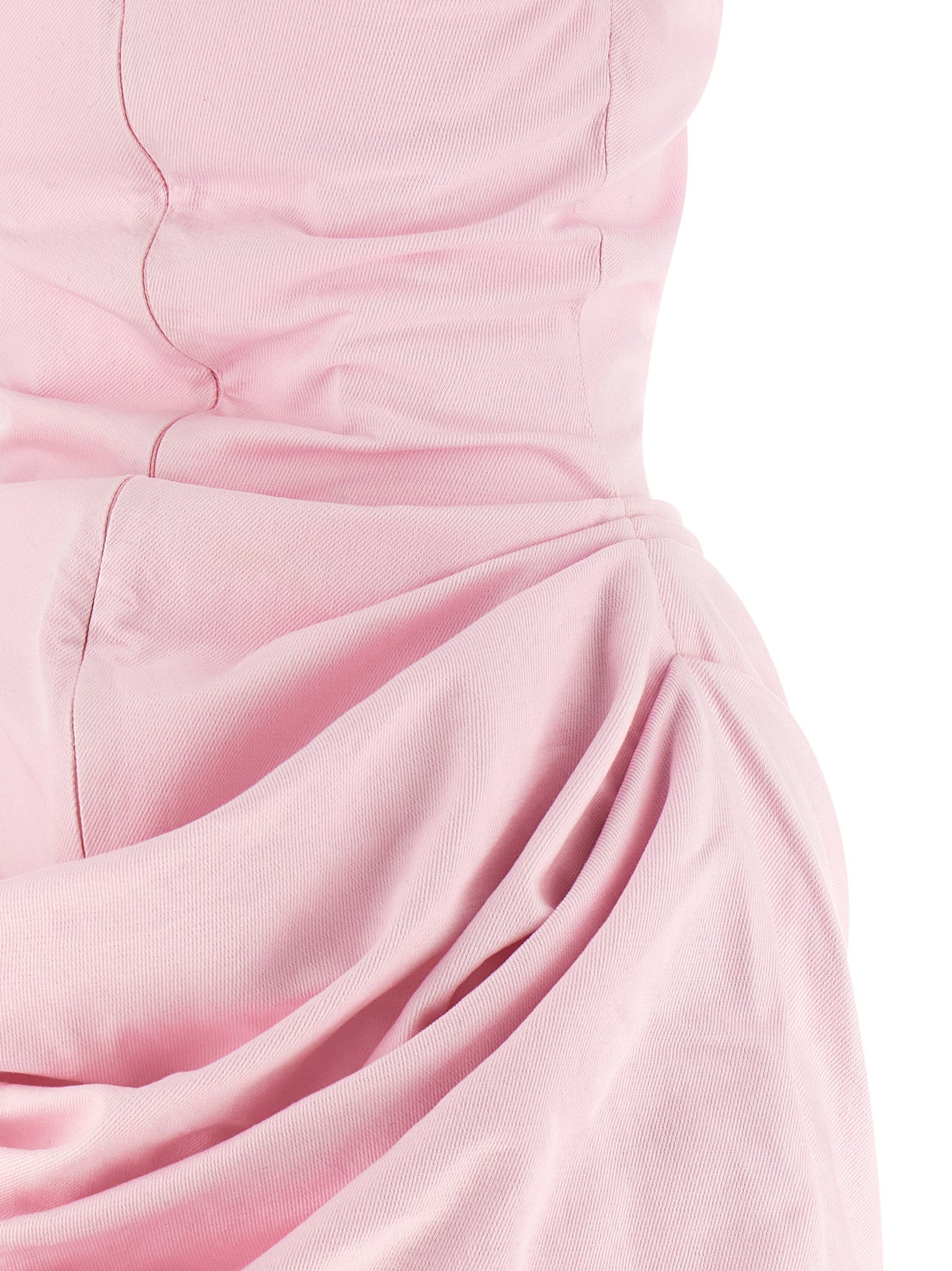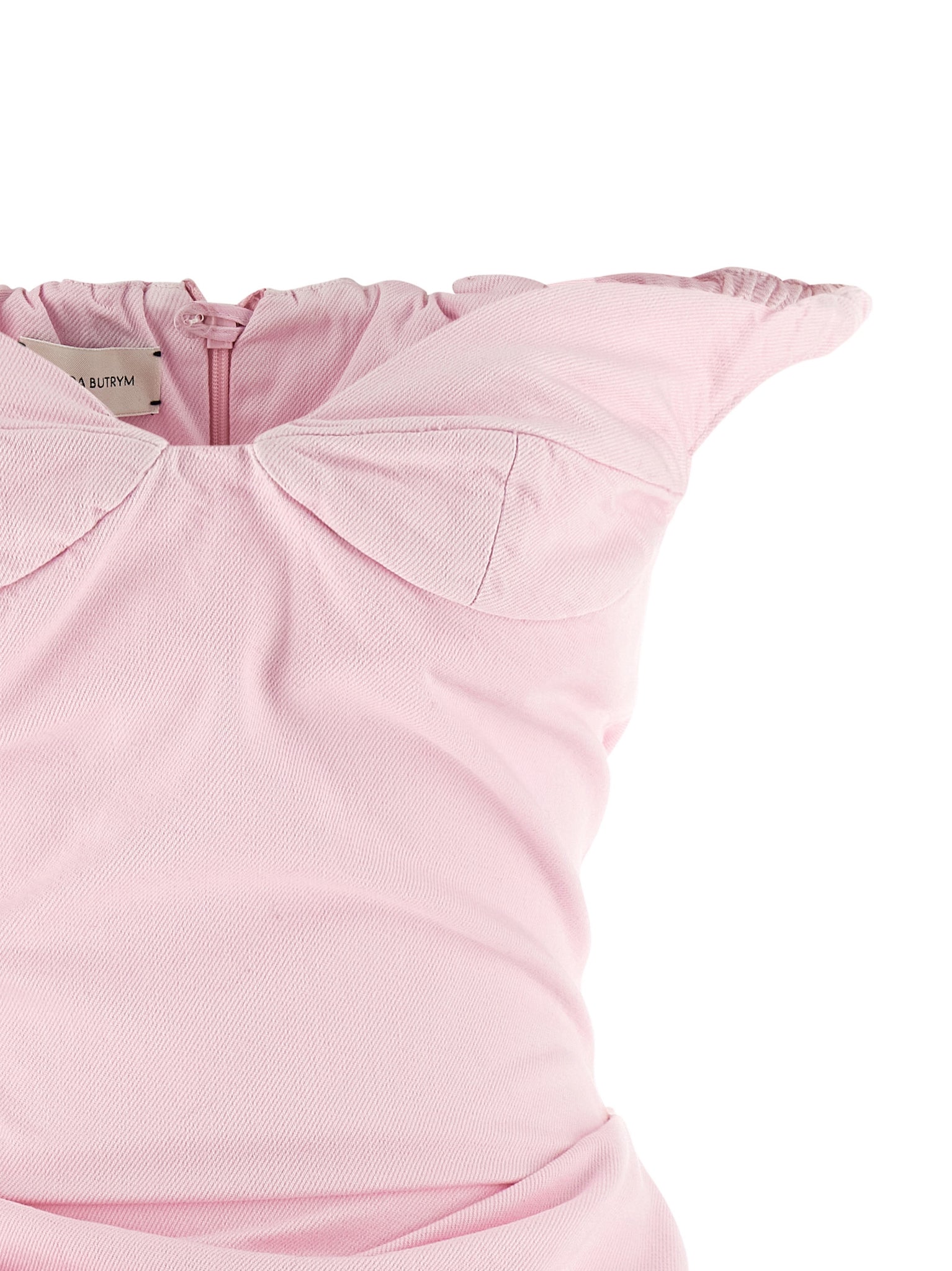 The Magda Butrym 14 Dress is an off-the-shoulder minidress in garment-dyed pink cotton denim that combines a bustier construction with pre-shaped cups and a sweetheart neckline for structured support. Its curled upper elastic and draped skirt detail create soft movement while a back zip closure ensures a secure fit. Designed to fit true to French sizing, the silhouette balances tailored shaping with wearable comfort for evening or daytime occasions.