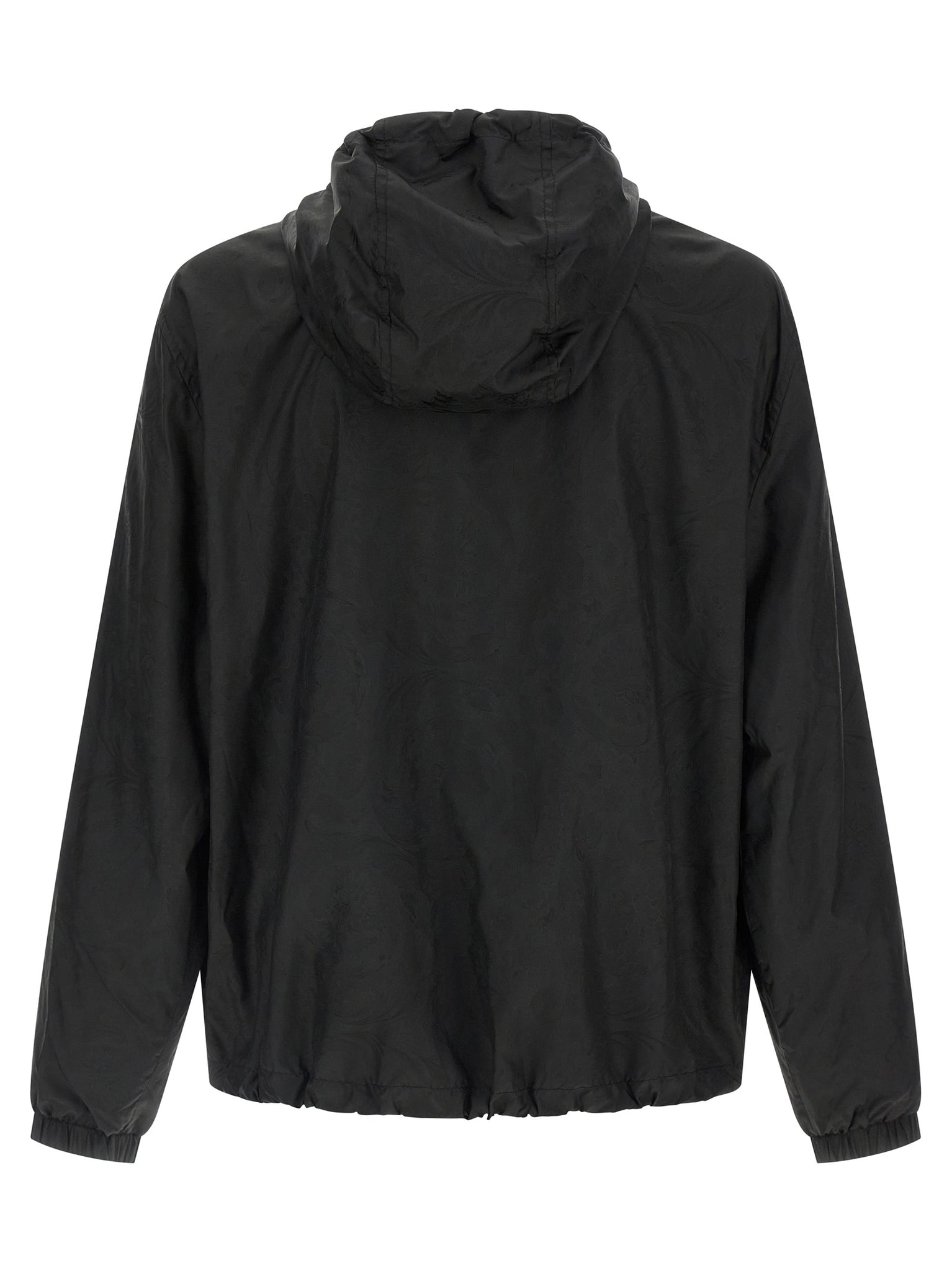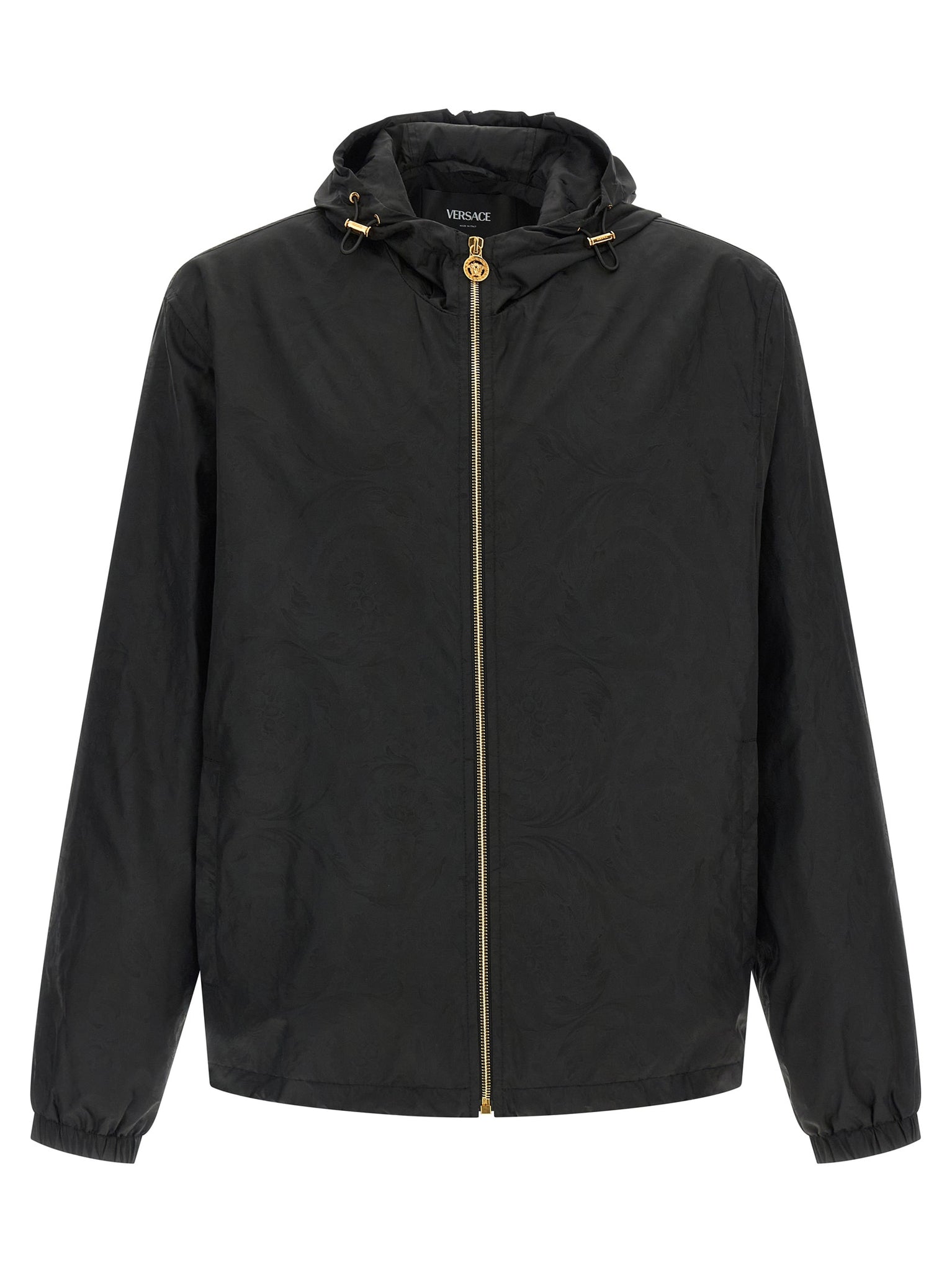 Windbreaker with tonal 'Barocco' jacquard pattern, adjustable hood, front zip closure with 'Medusa Biggie' zipper, pockets, long sleeves with elastic cuffs, drawstring on the hem. Size and Fit - true to size fit