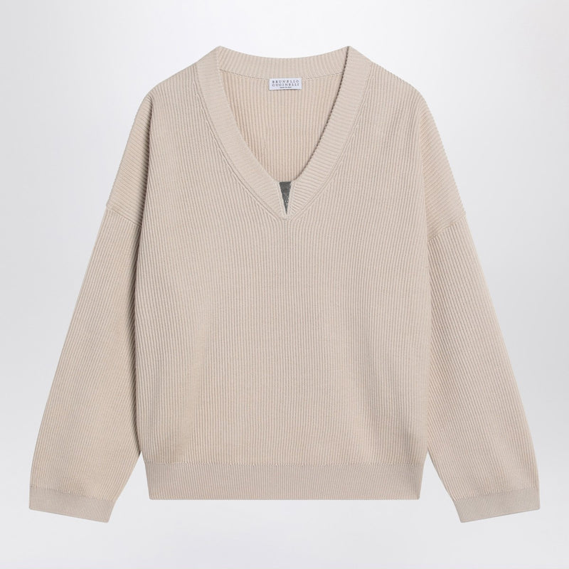 Light beige cotton sweater by Brunello Cucinelli, featuring long sleeves, a wide V-neck with a central detail in jewellery, dropped shoulders, and a ribbed design. Size and Fit - Model wears size X S Model measurements: Height: 179 cm Chest: 83 cm Waist: 61 cm Hips: 88 cmMade in: Italy