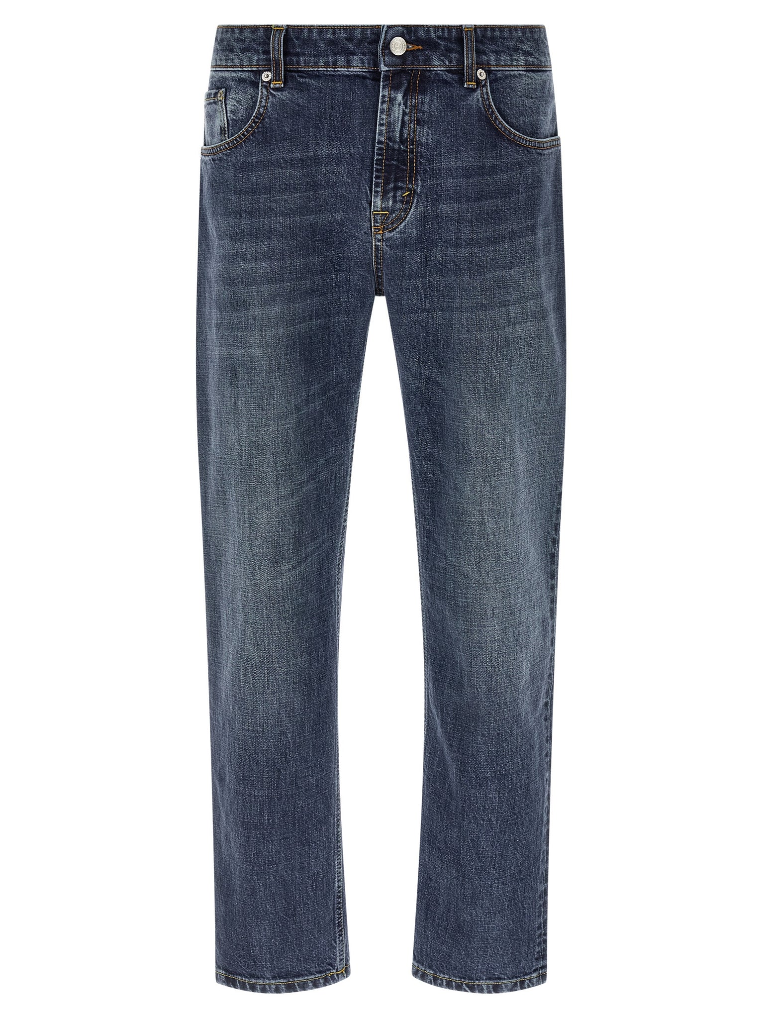 'talk' stone-washed cotton denim jeans with contrast stitching, Crop style, Straight leg, Regular waist, Front zip and button closure, Five pockets, Back logo tag. Size and Fit - true to size fit