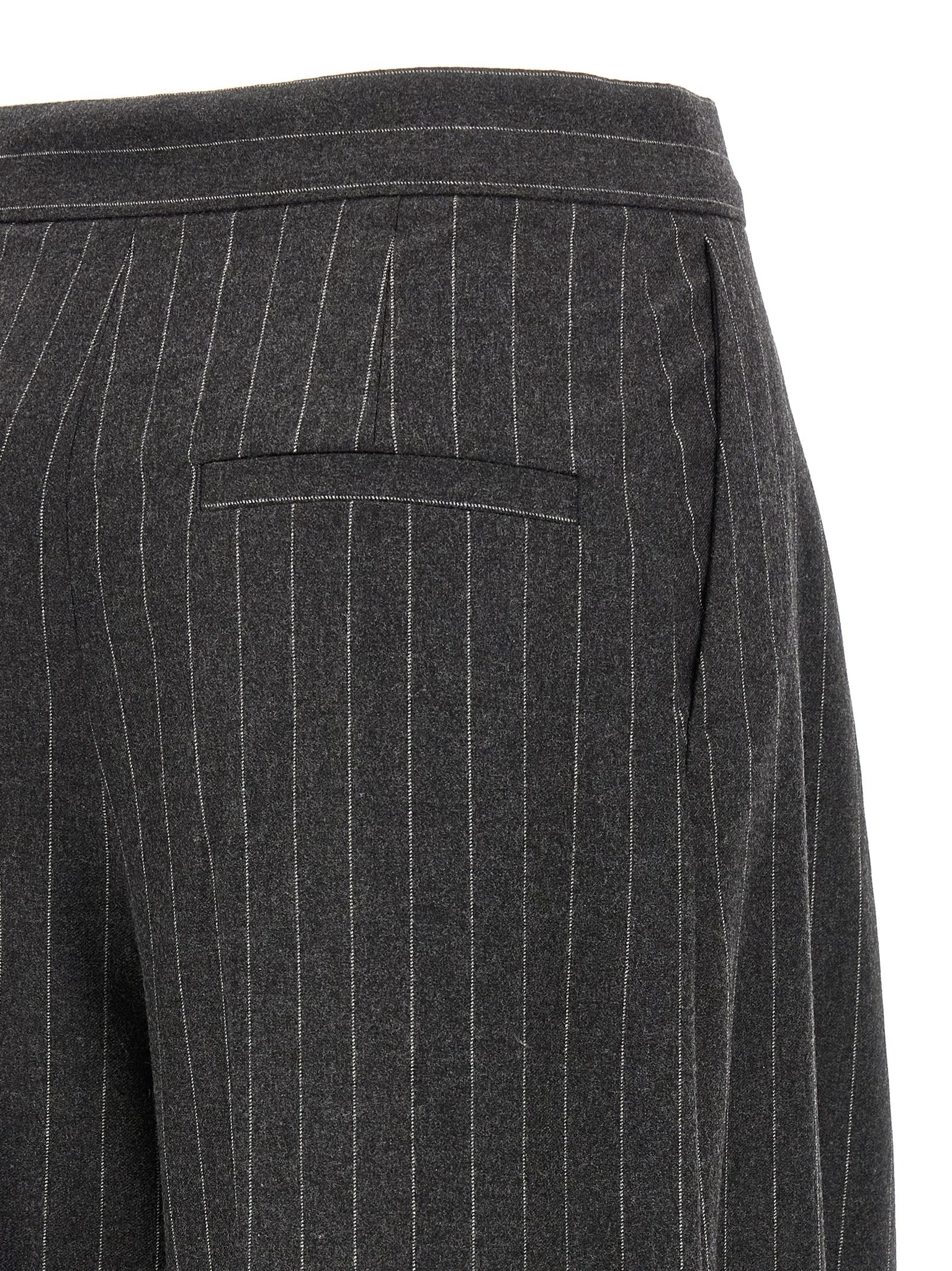 'Belgio1234' pants in wool blend and viscose stretch canvas with pinstriped pattern, stretched pleat, slightly low waist, extra wide leg, zip hook and front button closure, pockets. Size and Fit - true to size fit