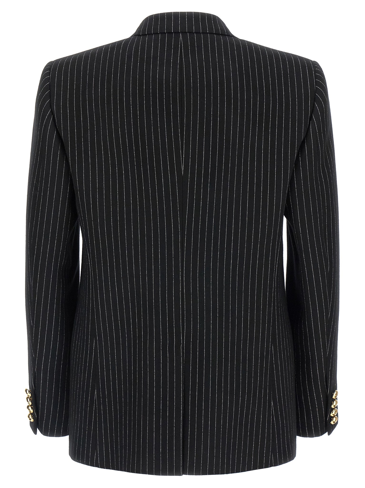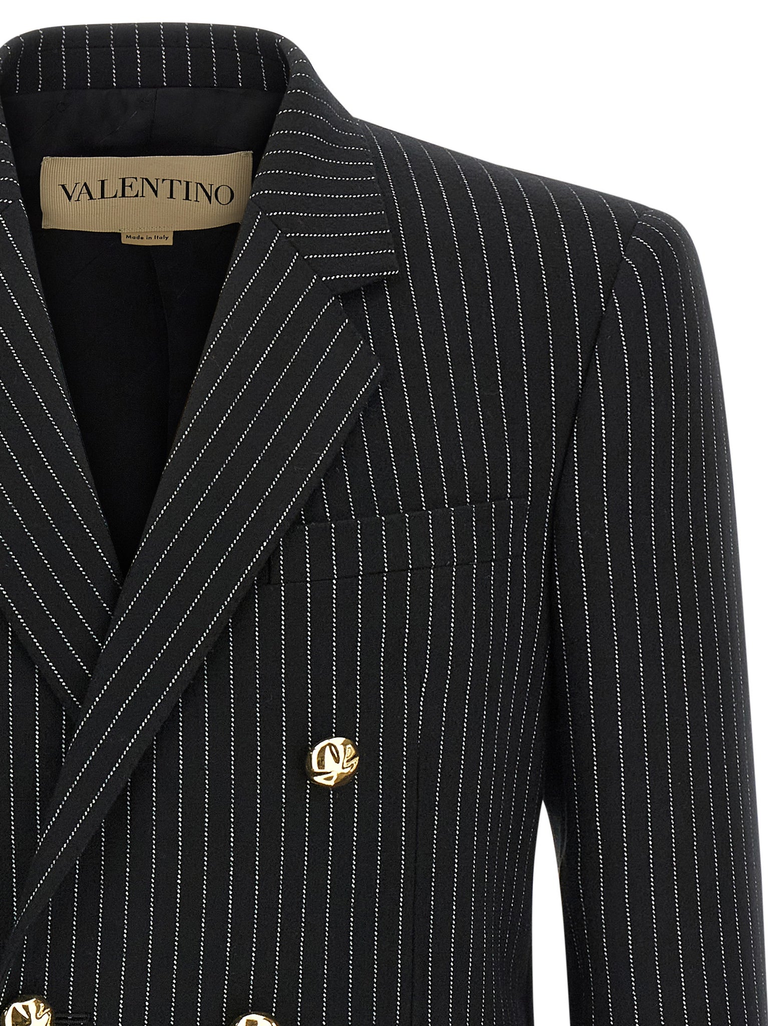 'Valentino' pinstripe patterned wool and silk blazer jacket, full canvas construction, double-breasted model with front metal button closure, mirror lapels, breast pocket, flap pockets, padded shoulder strap, cuffs with opening buttonholes, back split, monogram cupro lining. Size and Fit - true to size fit