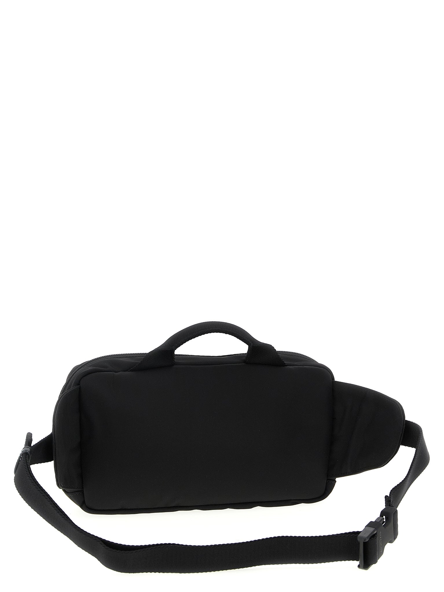 Nylon fanny pack, 'Essential U' line, fixed handle and top zip closure, metal logo lettering and front zip pockets, tape shoulder strap with tuc closure. Size and Fit - W 27 x H 15 x D 8 cm