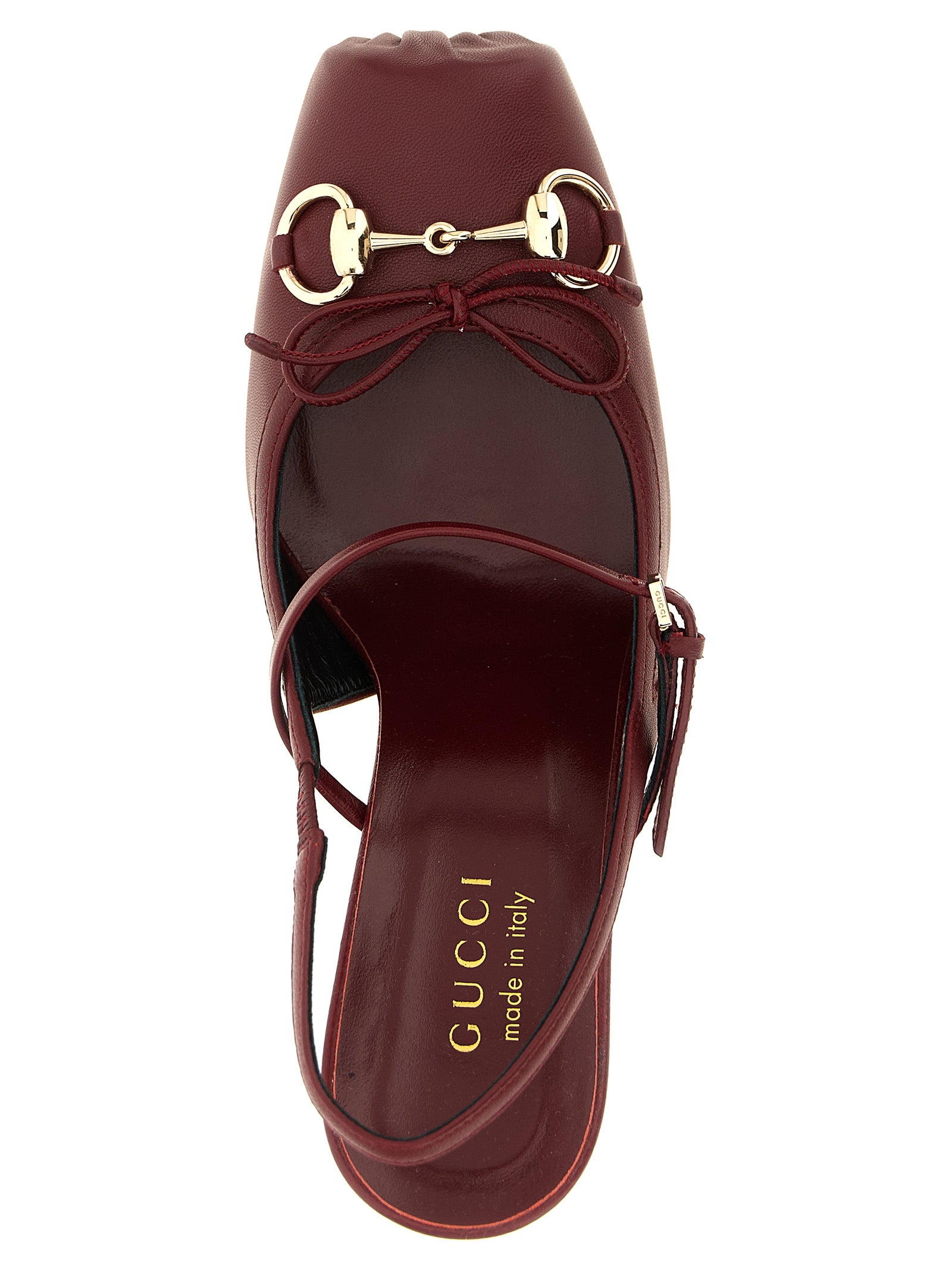 'gucci' leather 'gucci rosso ancora' slingbacks, Bag structure with squared closed toe, Metal clamp detail and tone-on-tone bow on the front, Adjustable strap on the instep, Back elastic strap, Big heel, Leather sole. Size and Fit - EU WOMAN - Heels: