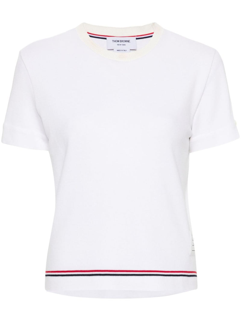 white cotton piqué knit construction ribbed crew neck short sleeves split cuffs logo patch to the side short side slits RWB stripe to the hem rear signature grosgrain loop tab straight hem Size and Fit - This piece fits true to size. We recommend you get your regular size. Model is 1,75m / 5ft 8in wearing size 40 (IT)