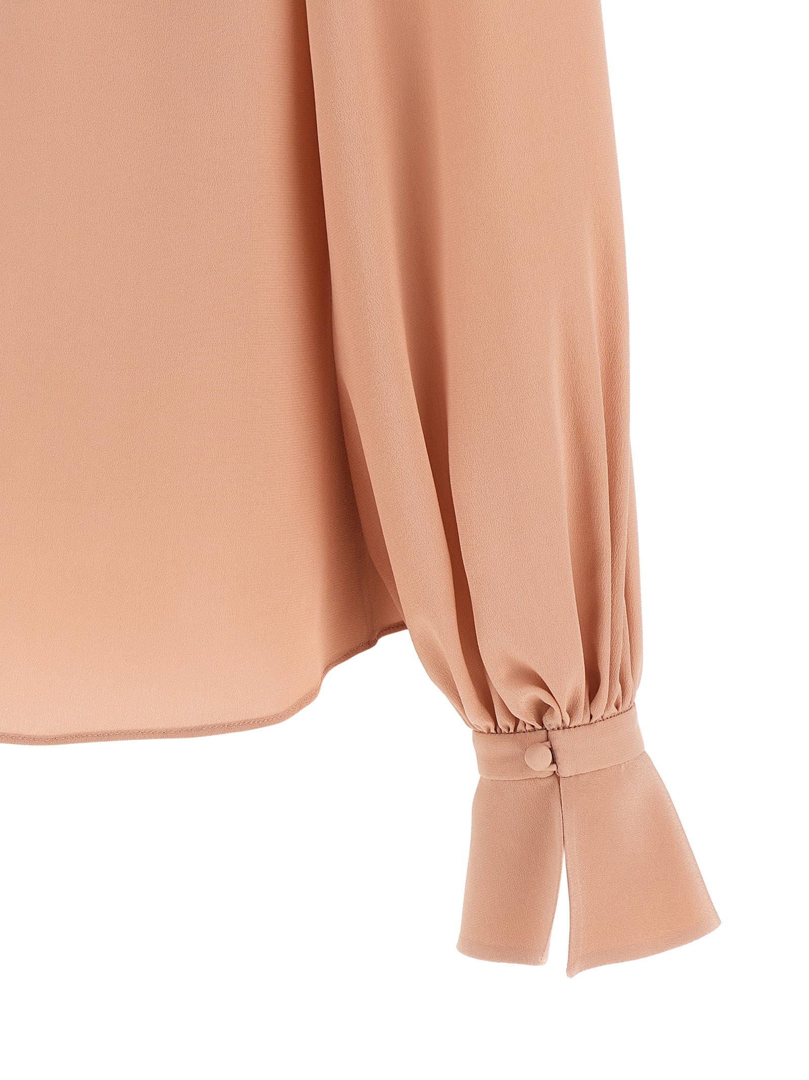 Crêpe de chine top with maxi tone-on-tone floral appliqué and front pleated pleats, High neck with back button closure and cut-out teardrop detail, Long sleeves with flared cuffs and asymmetrical hem. Size and Fit - true to size fit