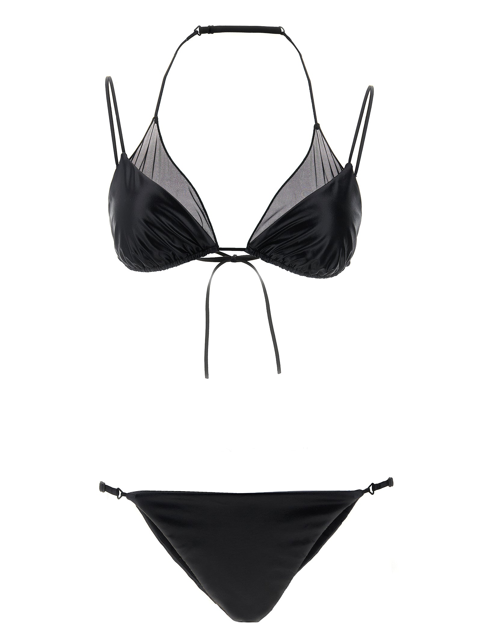 Discover a refined satin lycra bikini that pairs a double‑layer triangle top and semi‑transparent tulle underlayer for subtle coverage and shape. The adjustable neck braces and thin straps let you customize fit while the tie‑back secures the top comfortably. Low‑waisted bottoms offer medium coverage with side ties so you can fine‑tune hips and silhouette.