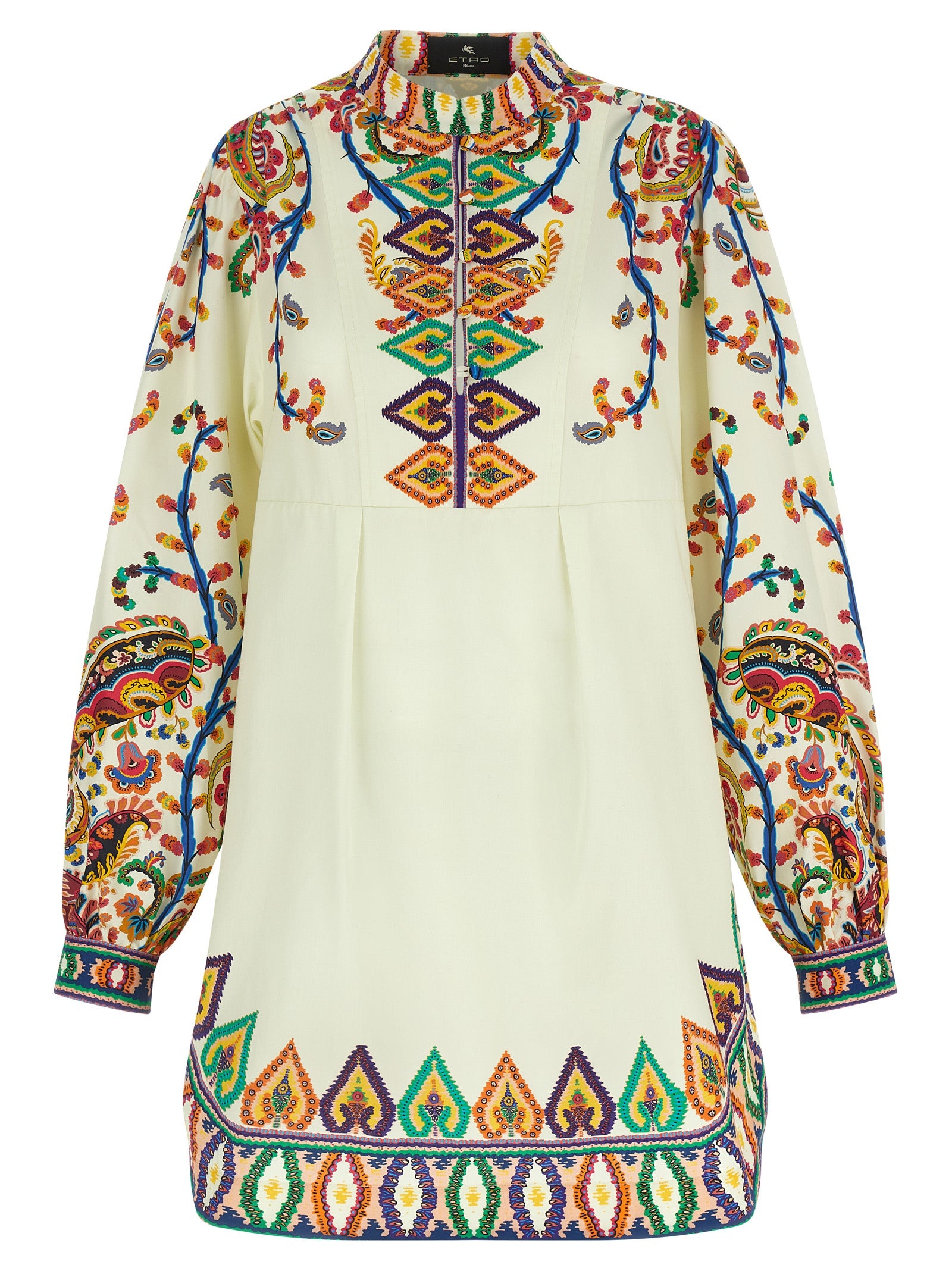 Cotton poplin mini dress with paisley print placed, Mandarin collar, Front closure with covered buttons, Side pockets, Round hem, Long wide sleeves on the slightly curled hem with button-opening cuffs. Size and Fit - True to size fit