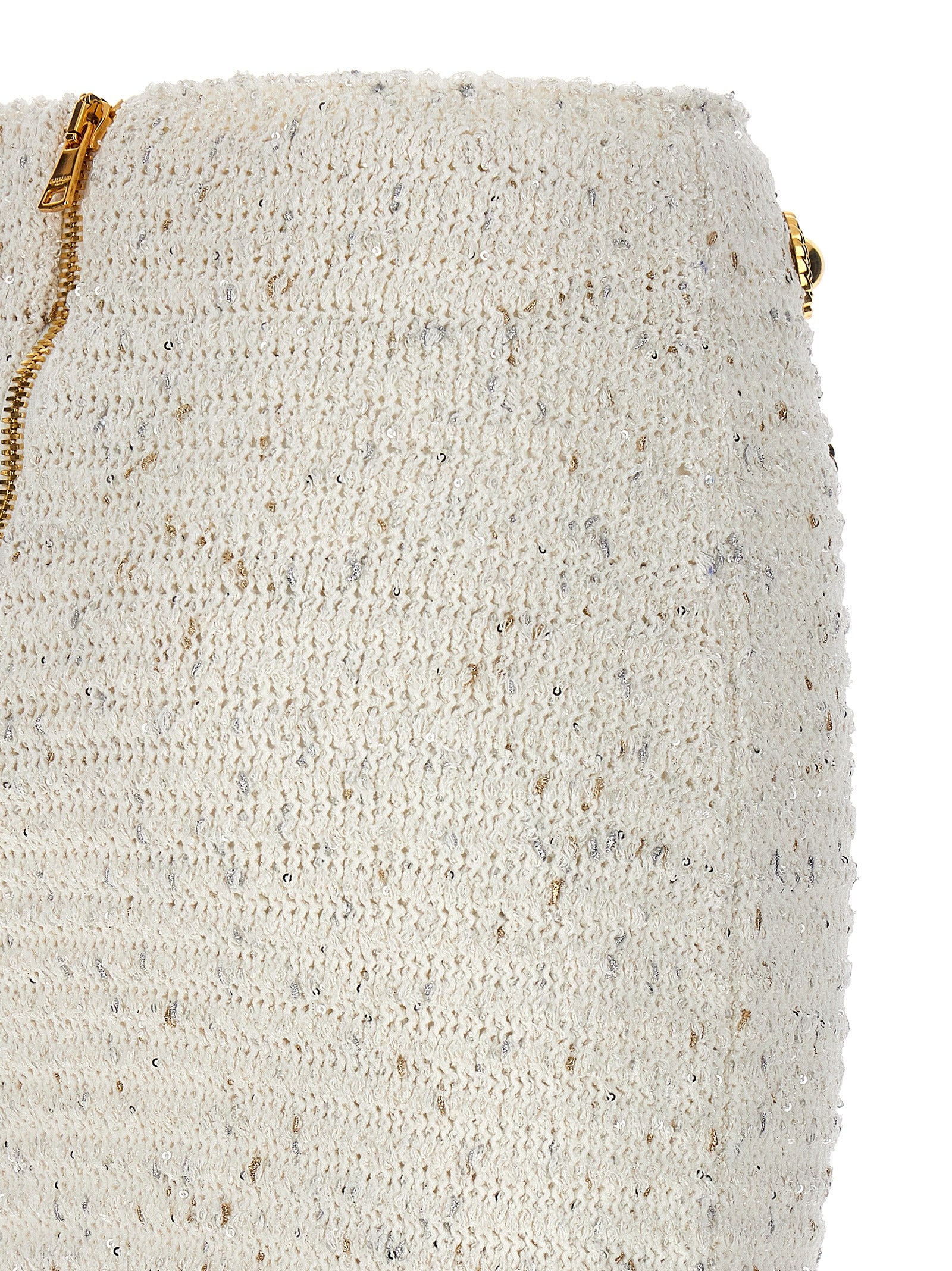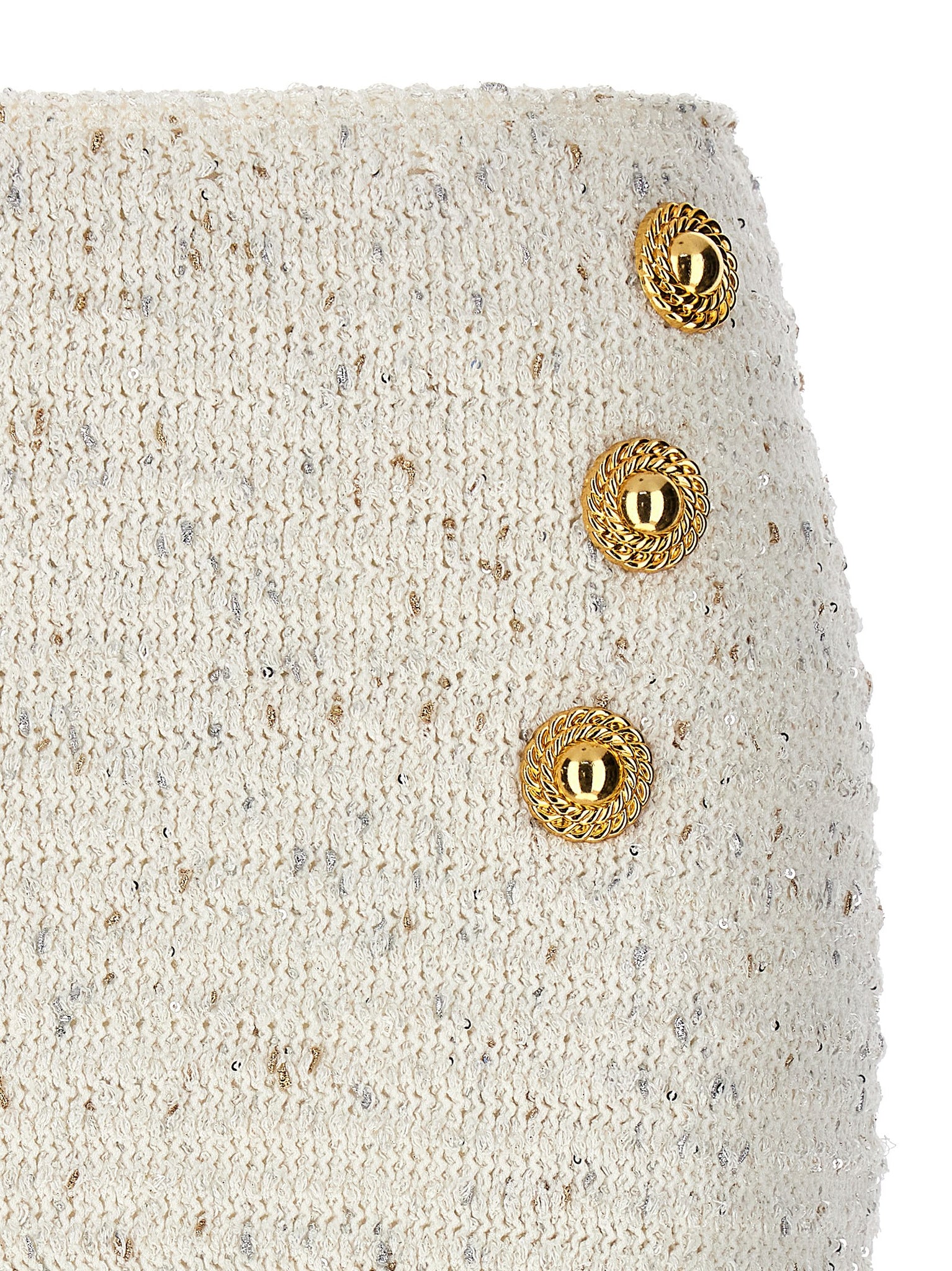 'Fringed Tweed' tweed skirt with sequins and fringes on the hem, front logo buttons, back zip closure. Size and Fit - true to size fit French size
