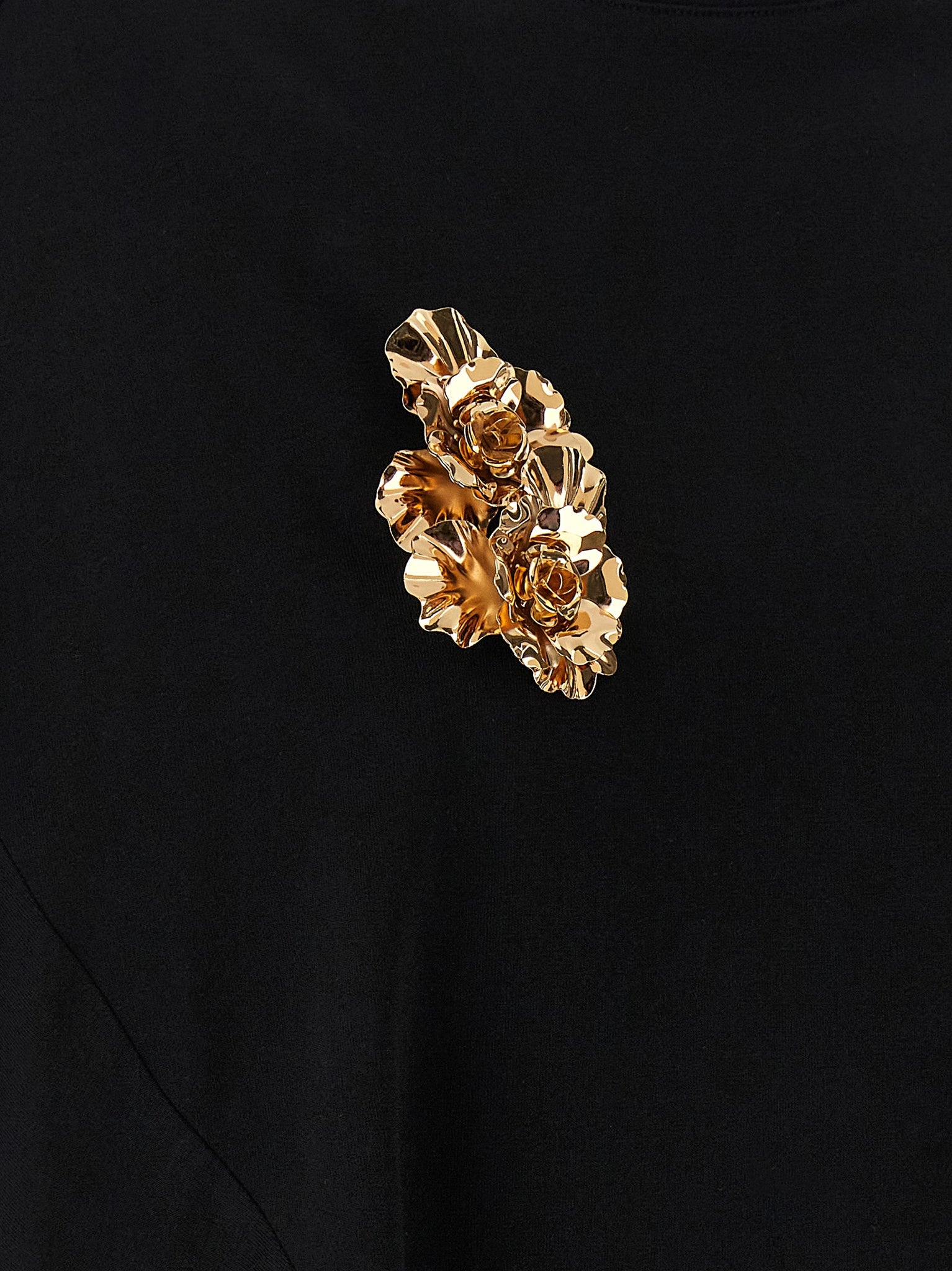 Cotton t-shirt, Tone-on-tone grosgrain piping, Panel construction, Double removable floral metal brooch, Crew neck, Wide asymmetrical short sleeves with cuffs, Rounded and asymmetrical hem.