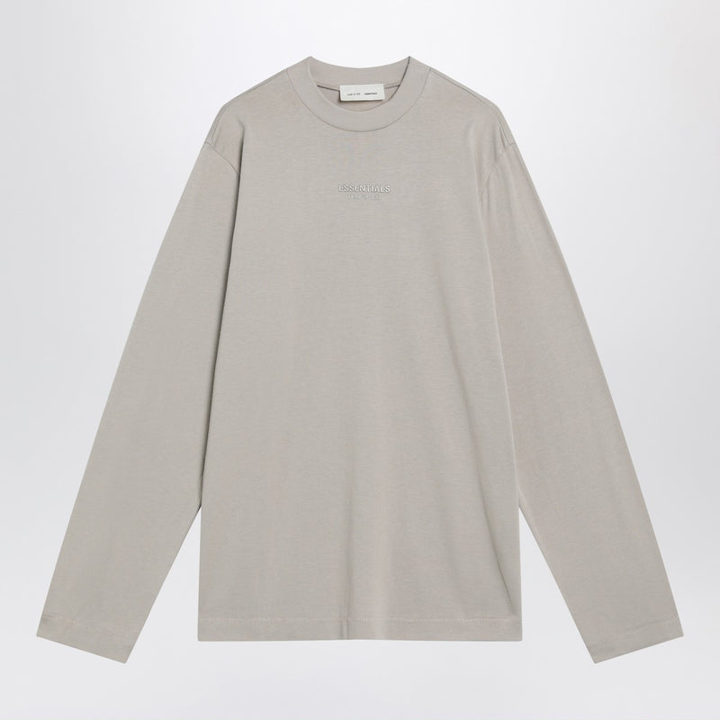 Top de mezcla de algodón color crudo de Fear Of God Essentials, con mangas largas, cuello redondo acanalado, parche del logo en la espalda y letras del logo en relieve en la parte delantera.