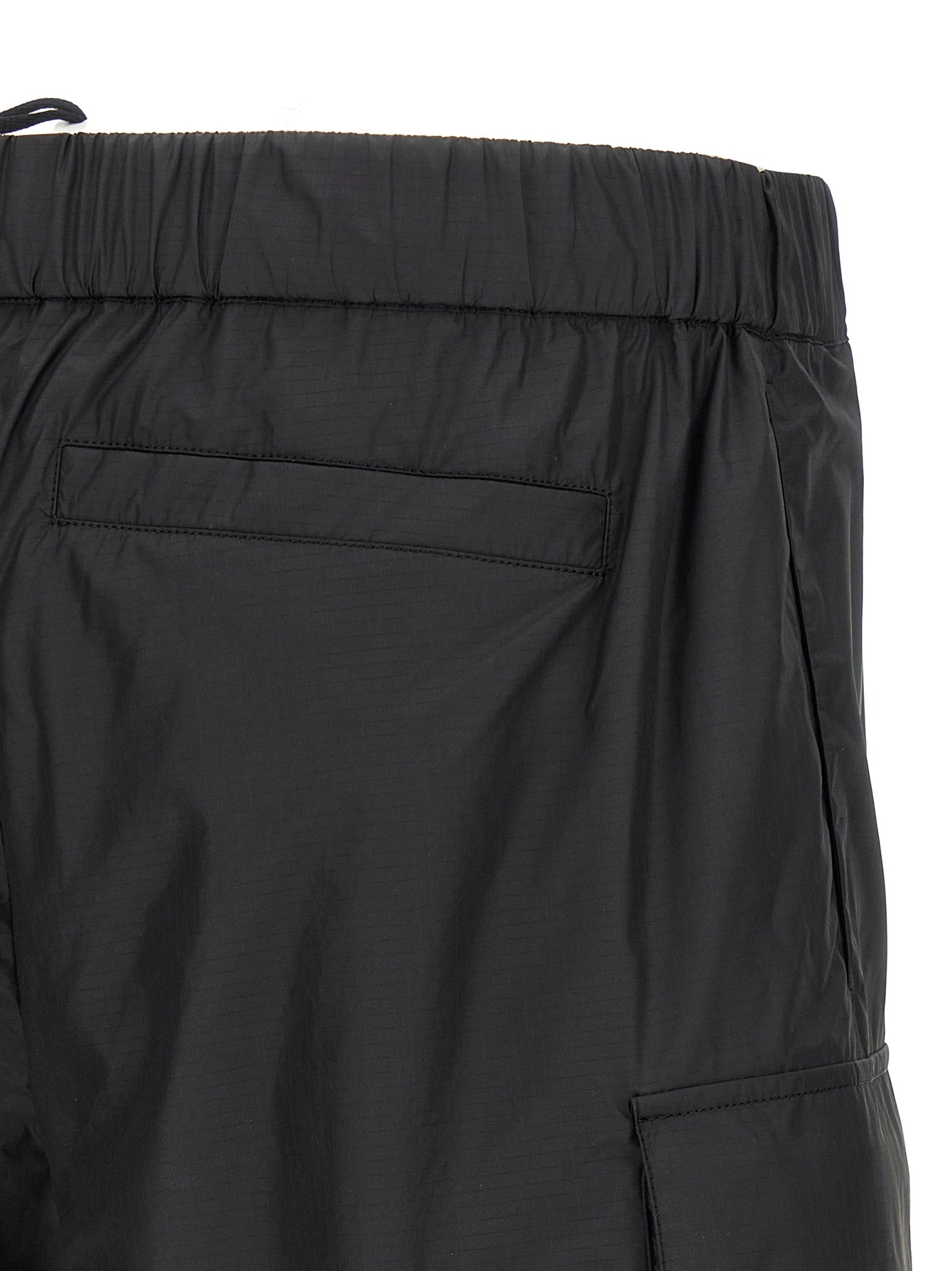 Discover lightweight, durable Bermudas cut from ripstop fabric with a breathable mesh lining for comfort during warm-weather wear. These cargo shorts feature an elastic drawstring waist, practical pockets and a tone-on-tone silicone logo patch for a subtle brand touch. The trompe l'oeil flap adds visual interest while the construction keeps the fit true to size.