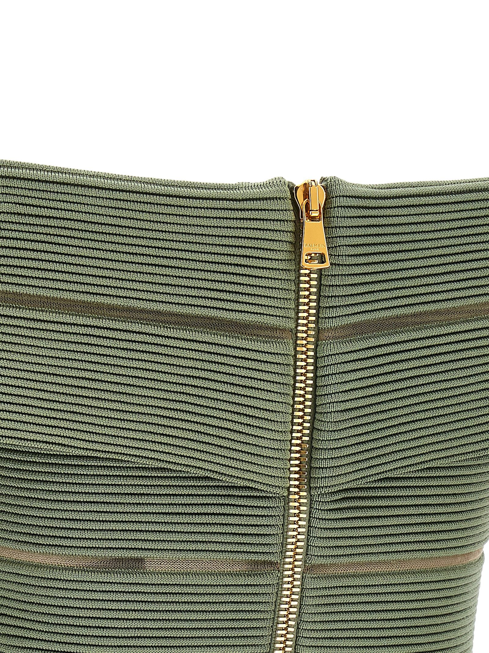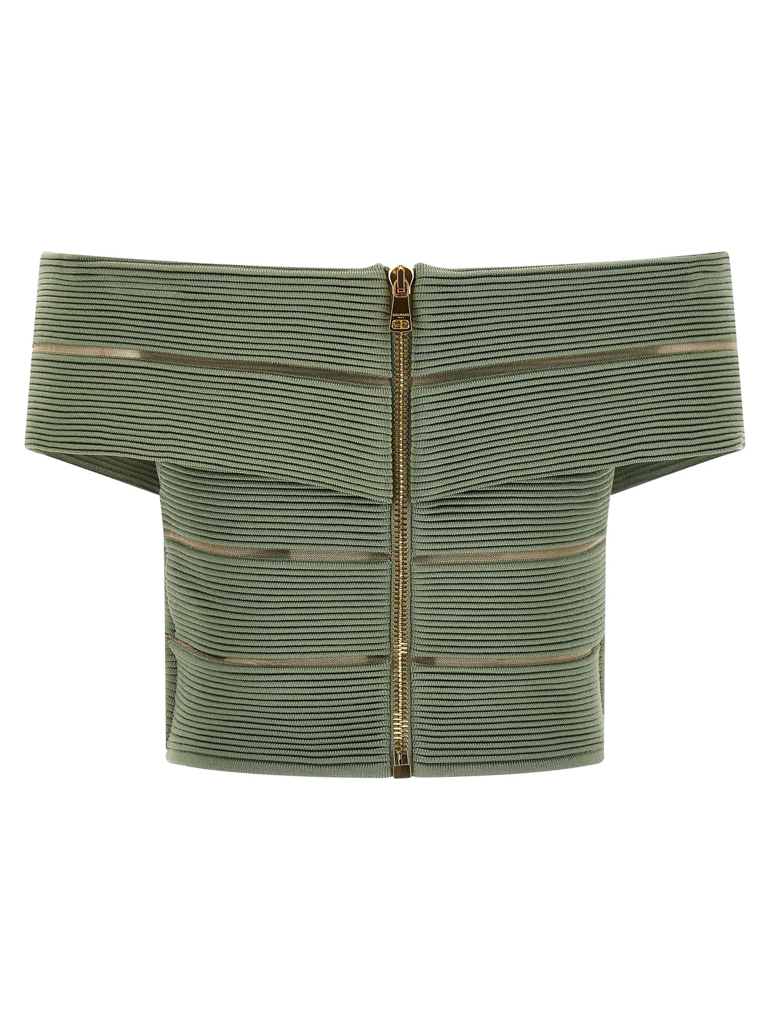 This Balmain Off-the-shoulder Crop Top in green offers a figure-flattering cropped silhouette that highlights the collarbone while providing light stretch for comfort. Transparent mesh inserts and a layered V-front with an X-insert add visual interest, and a back zip closure ensures a sleek fit. Designed in French sizing, the top fits true to size and is crafted from stretch viscose for a soft, structured feel.