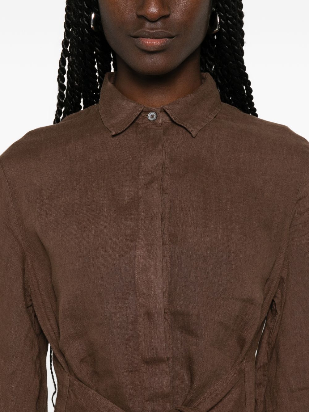 brown classic collar front button fastening three-quarter length sleeves tied waist side splits Linen chemisier dress.