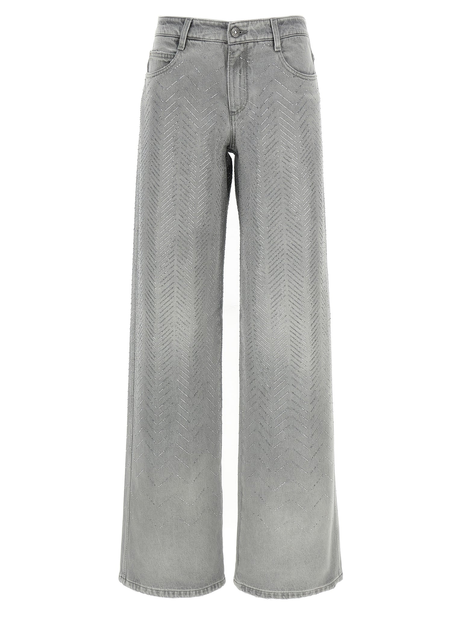 Used-effect garment-dyed cotton denim jeans with all-over rhinestone appliqué, five pockets, front zip and button closure, wide straight leg, back leather logo tag. Size and Fit - baggy fit
