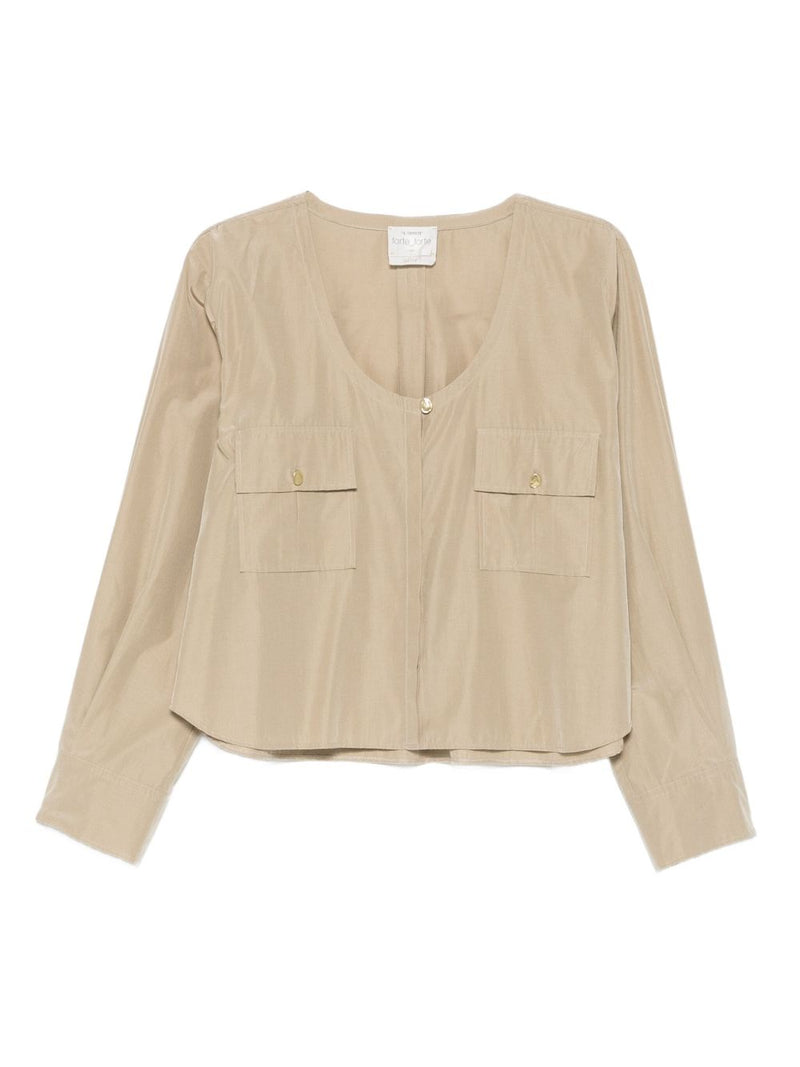 Discover a refined beige shirt from Forte Forte that balances neutral elegance with practical design, offering long sleeves and buttoned flap pockets for everyday versatility. The tailored cut flatters adult female proportions while the subdued tone pairs easily with layered wardrobes. Expect soft drape and comfortable movement suited to both casual and polished looks.