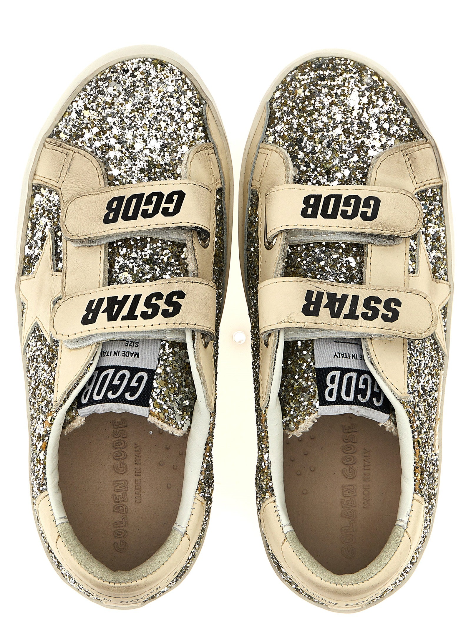 Kids_x000d_ 'old school' leather and glitter sneakers with contrast side star and heel, Velcro band closure and logo print, Rubber sole. Size and Fit - EU KIDS