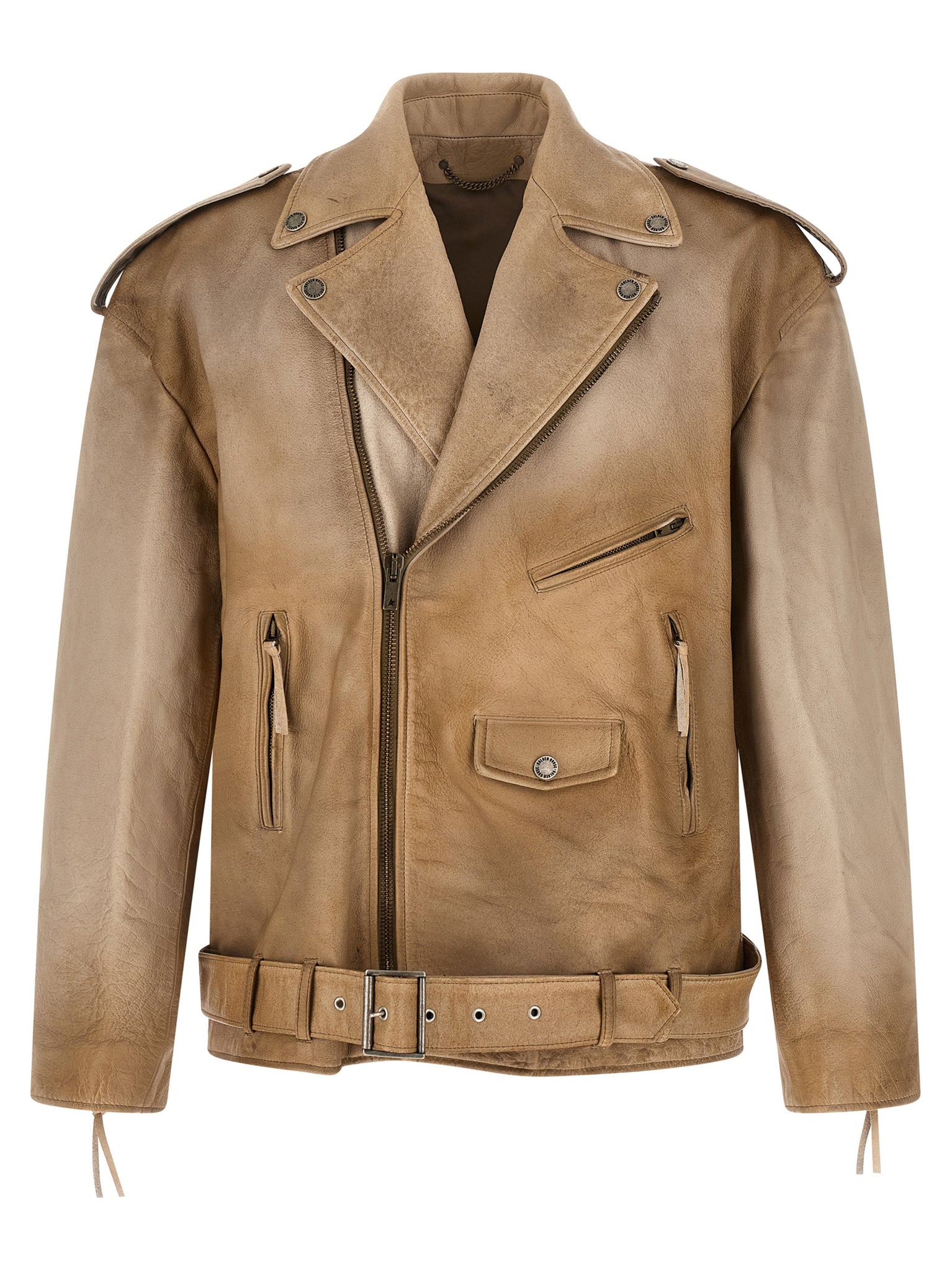 'Phoebe' biker jacket in vintage leather with lapel collar, front asymmetric zip closure, pockets, long sleeves with zip on the cuffs, removable belt. Size and Fit - oversized fit