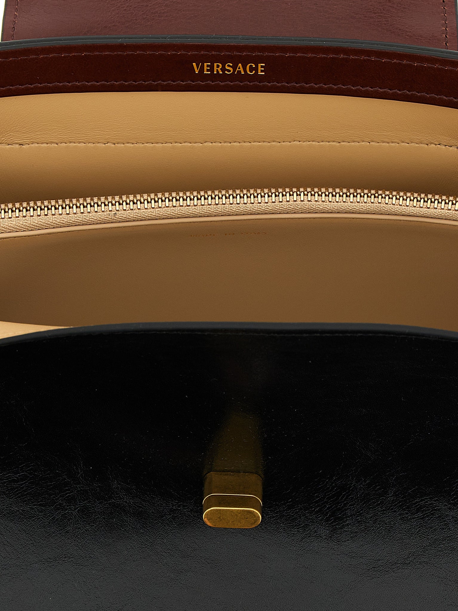 'vivian' shoulder bag in soft plant-tanned leather with hand-painted edges and contrast details, East/west model, Rectangular design, Flap closure with antiqued metal turn mechanism with 3d 'medusa' applied, Double fixed tubular handle, Rigid base. Size and Fit - W 40 x h 20 x d 14 cm - handle span: w 22 cm