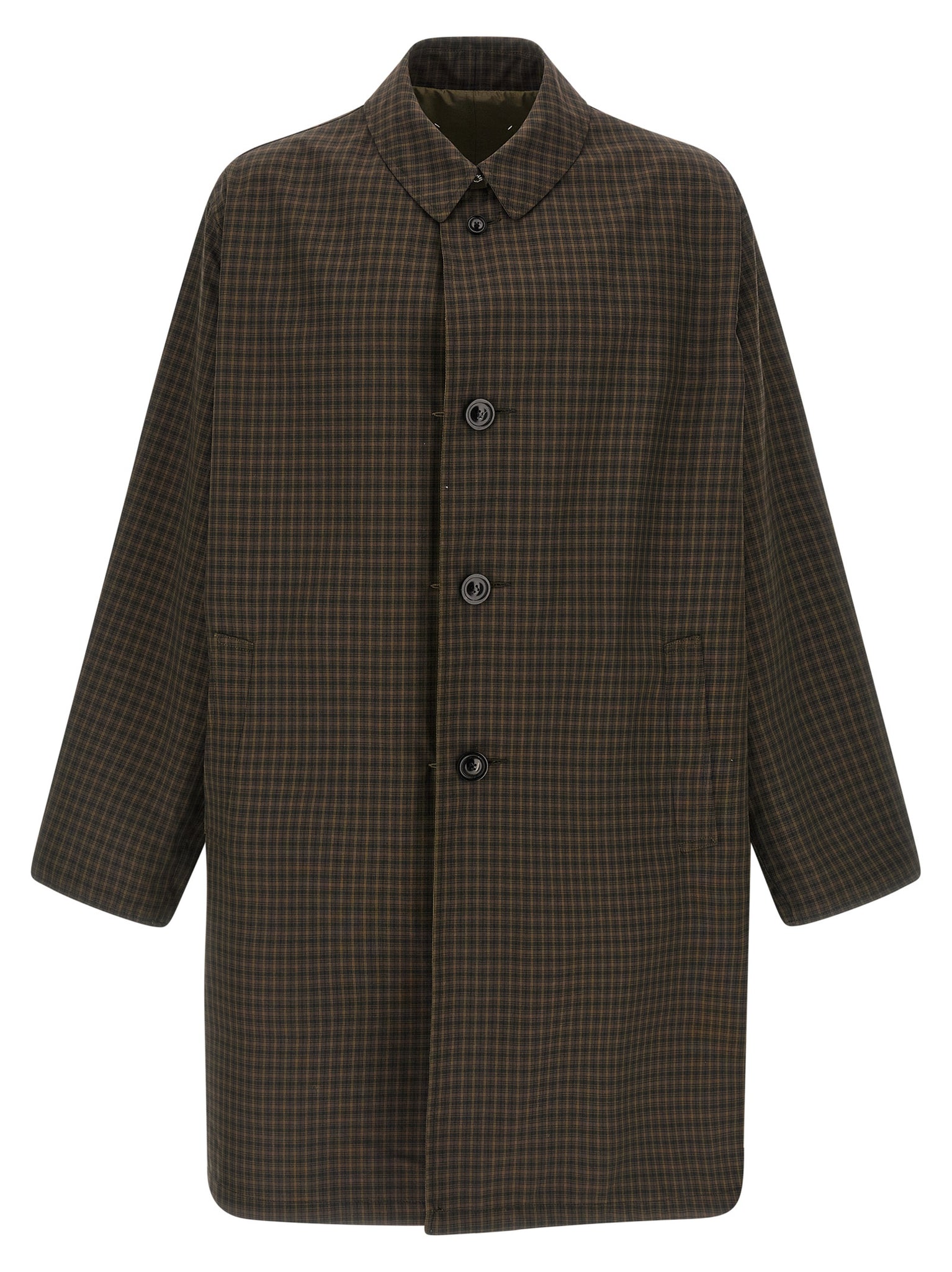 The Maison Margiela Four Stitches Reversible Trench Coat offers two distinct looks in one garment, switching between iridescent taffeta solid color and a check pattern for versatile styling. Designed with a shirt collar, front button closure, pockets, long sleeves with adjustable cuffs and a dropped shoulder, it features the label's signature four stitches at the back and fits true to size. Lightweight yet structured, the coat adapts from polished to casual wardrobes so you can compare outfits and decide how to wear it across seasons.