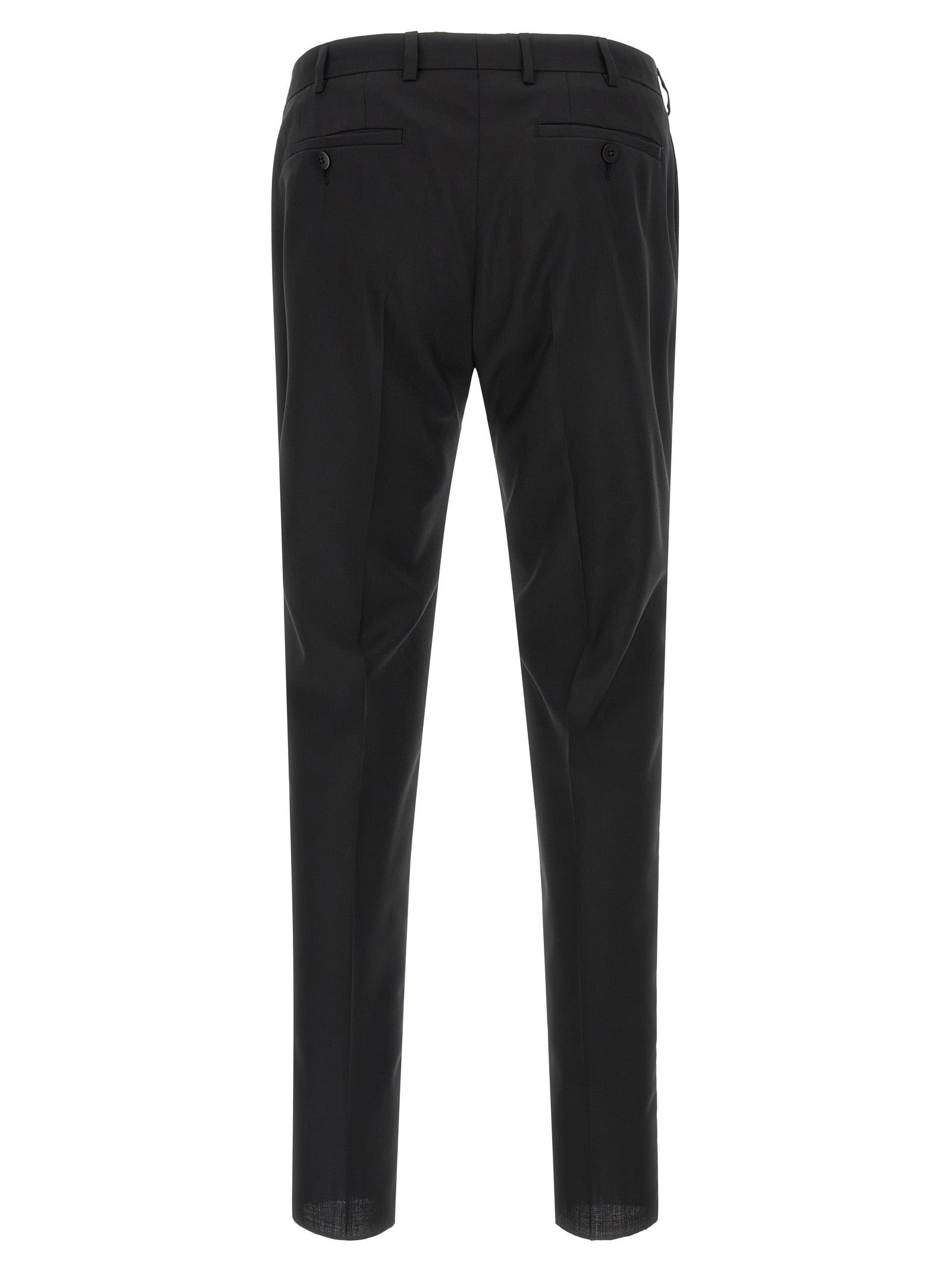Dress - ceremony line in cool wool with mother-of-pearl buttons consisting of single-breasted blazer with front button closure, Mirror lapels, Chest pocket, Flap pockets, Viscose lining, Two inner pockets, Structured shoulder strap, Cuffs with opening buttonholes, Back slits and trousers with stretched pleat, Front 'americane' pockets, Back welt pockets, Front zip and button closure, Viscose lining. Size and Fit - true to size fit - DROP 6