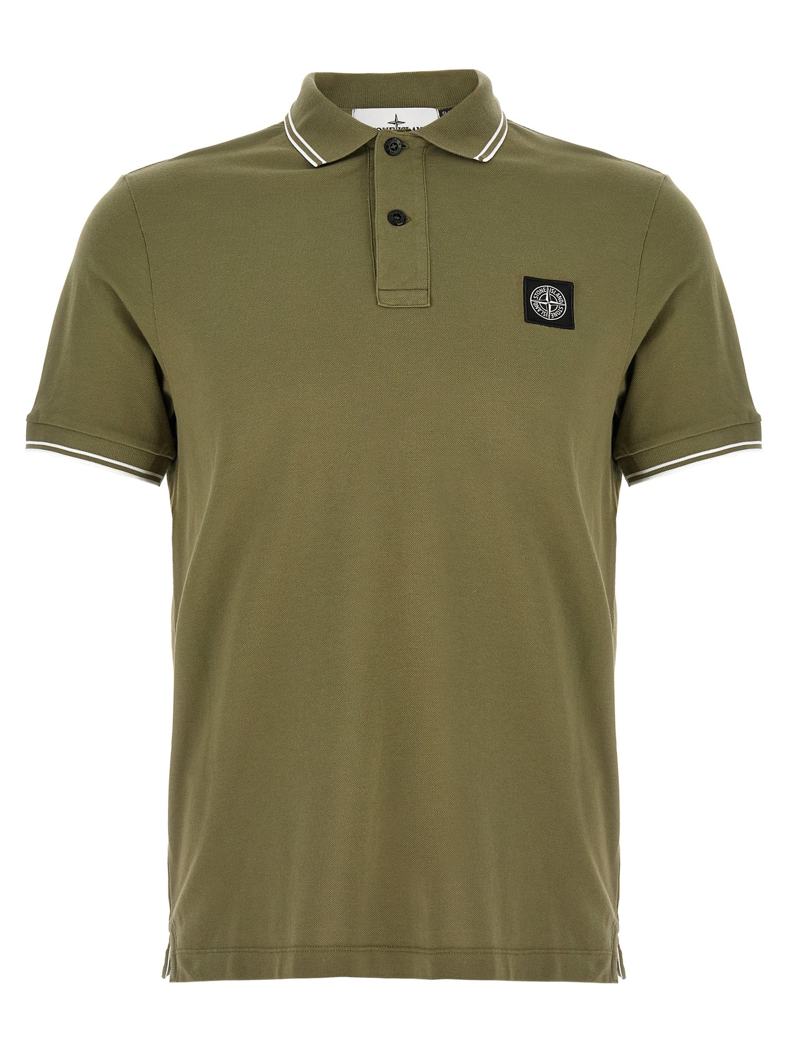 The Stone Island 2200010 Polo Shirt is a slim-fit cotton piqué shirt in green, made from organic cotton for a lower environmental impact. It features contrast details, a collared neckline with buttons, short cuffed sleeves, side slits and the signature compass patch at the chest. The construction offers a tailored silhouette that layers easily under jackets or wears solo for a refined casual look.