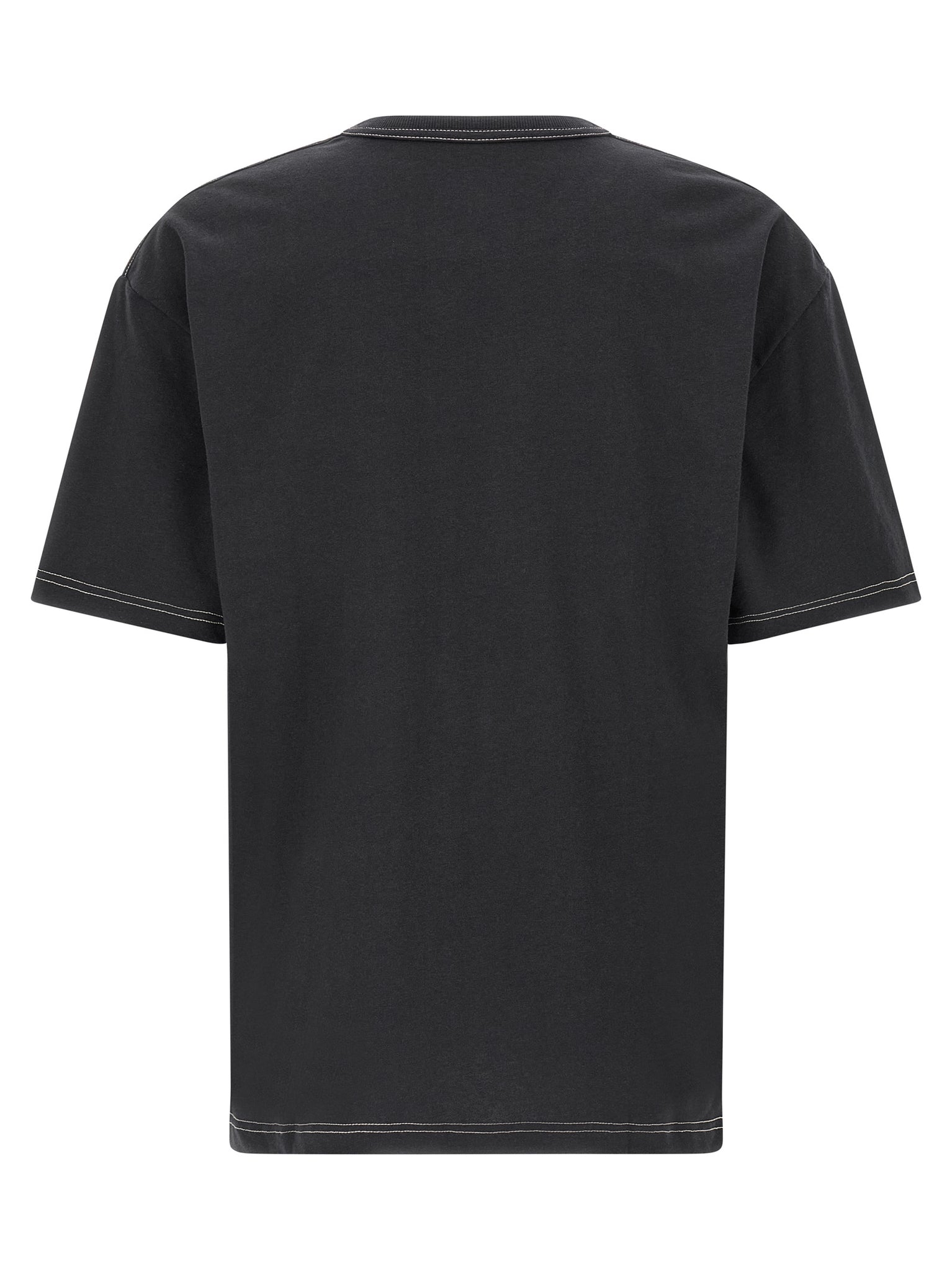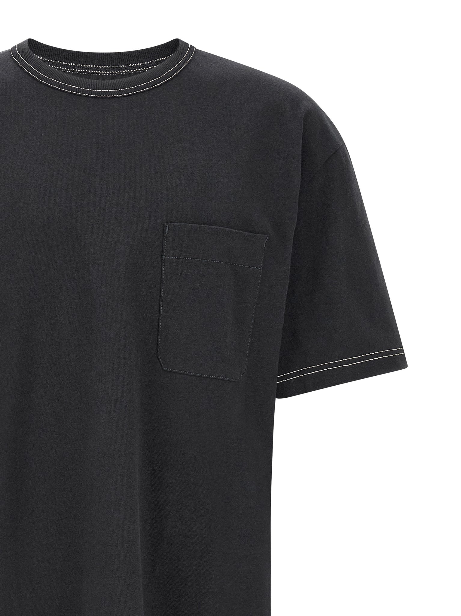'boxy' cotton and linen blend t-shirt with contrast stitching, Breast pocket, Crew neck, Short sleeves with dropped shoulders, Side slits on the hem. Size and Fit - oversized fit