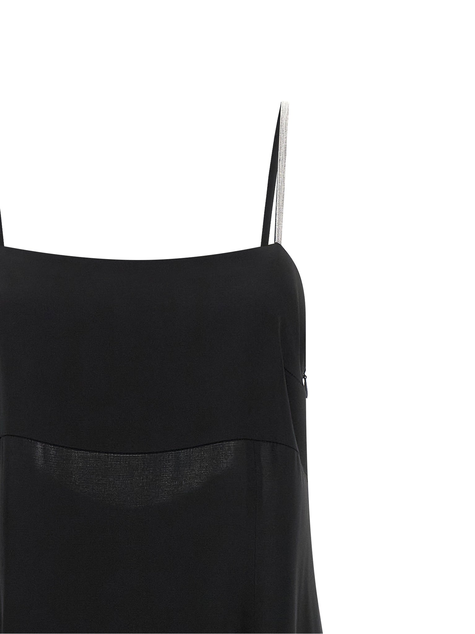 Discover the Peserico Aurea Dress in black shiny satin, a long model featuring an underbust cut and thin straps with a rhinestone-appliqué back band for refined evening wear. The gown fastens at the side with a hidden zip and presents a deep back neckline with a subtle cut-out effect to balance glamour and structure. Designed for an adult female silhouette, it fits true to size for straightforward selection and confident wear.